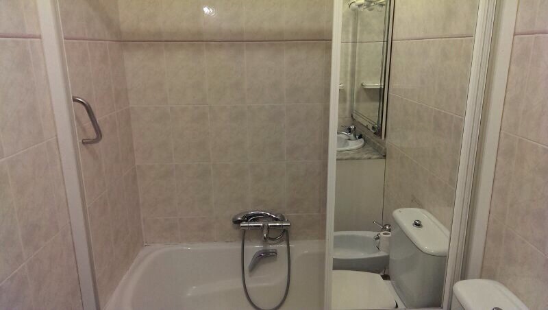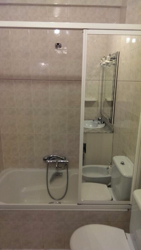 En este caso se trata de un baño con bañera entre 3 paredes, además de inodoro, bidé y mueble de lavabo con encimera de mármol con espejo y apliques.