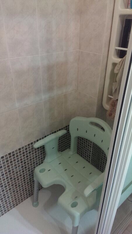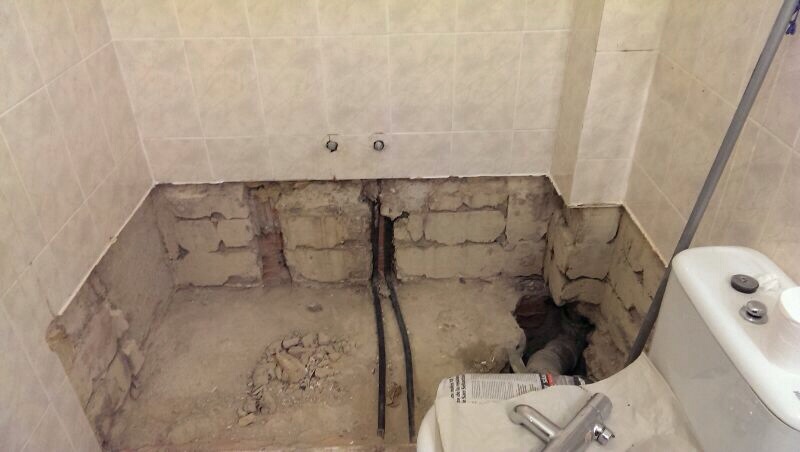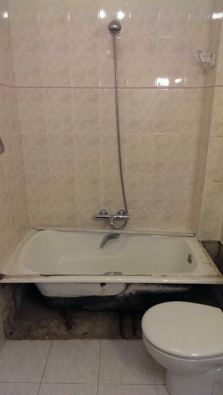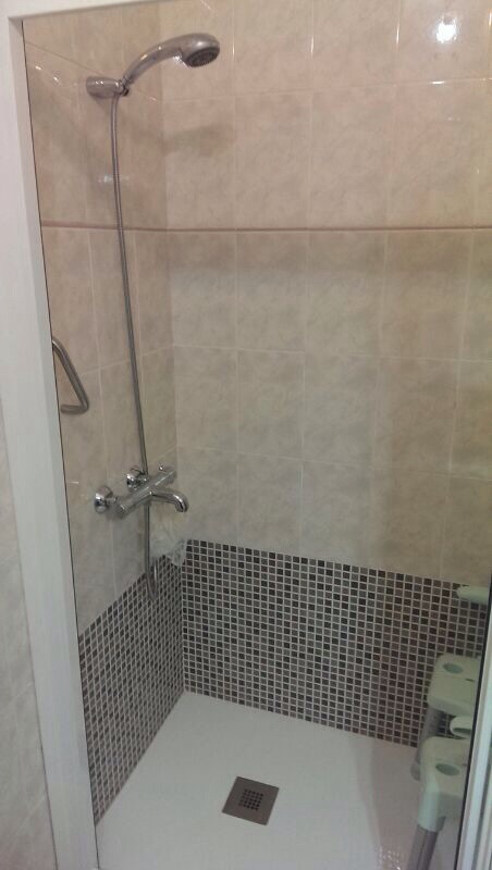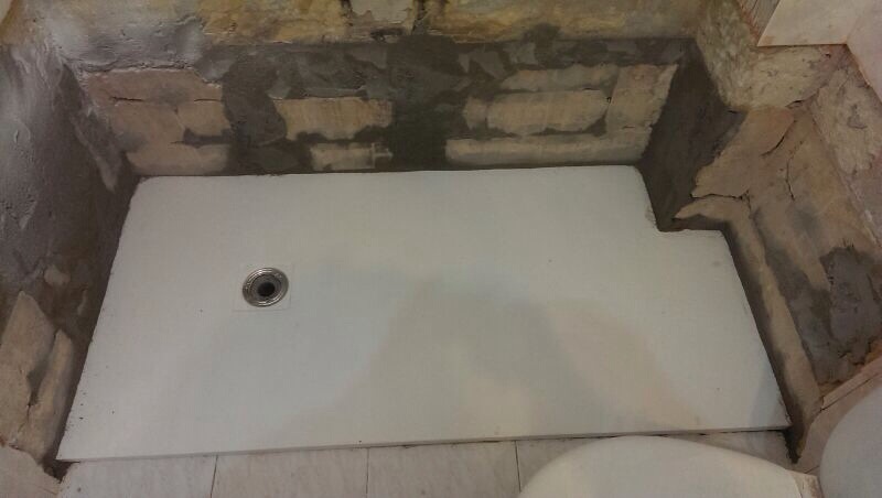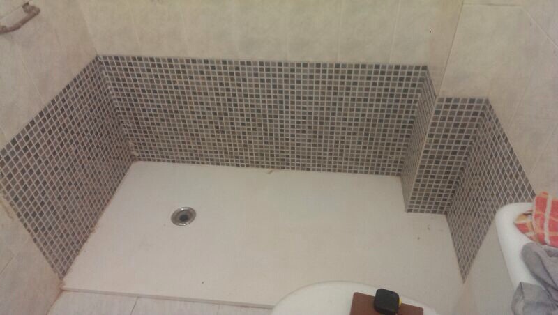 Una vez quitada la bañera, se pican los azulejos hasta 1m. ,se reforma el desagüe y se coloca el plato de ducha, es un plato de resina antideslizante y extraplano de 3cms., dándole la forma de la columna que se ve a la derecha.