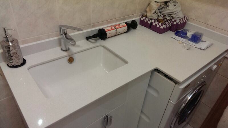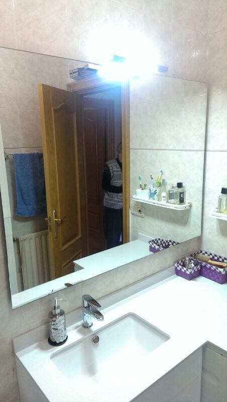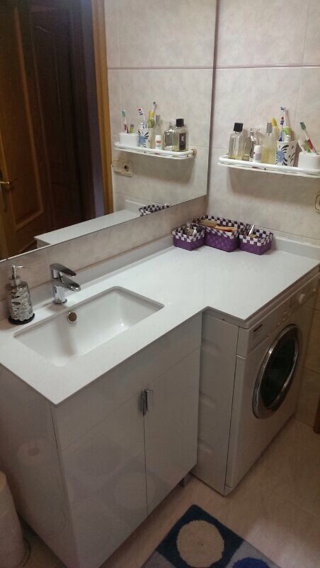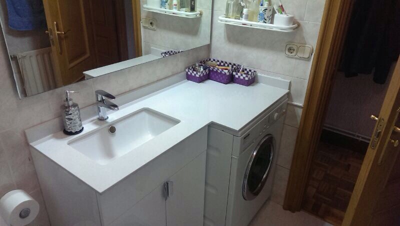 El mueble va donde estaba el bidé, y la lavadora que ocupa más sitió en la esquina, pero no es problema, ya que se aprovechan las tomas existentes, unido todo por una encimera de mármol y con un espejo de 120×90 con luz de un apliqué Led.