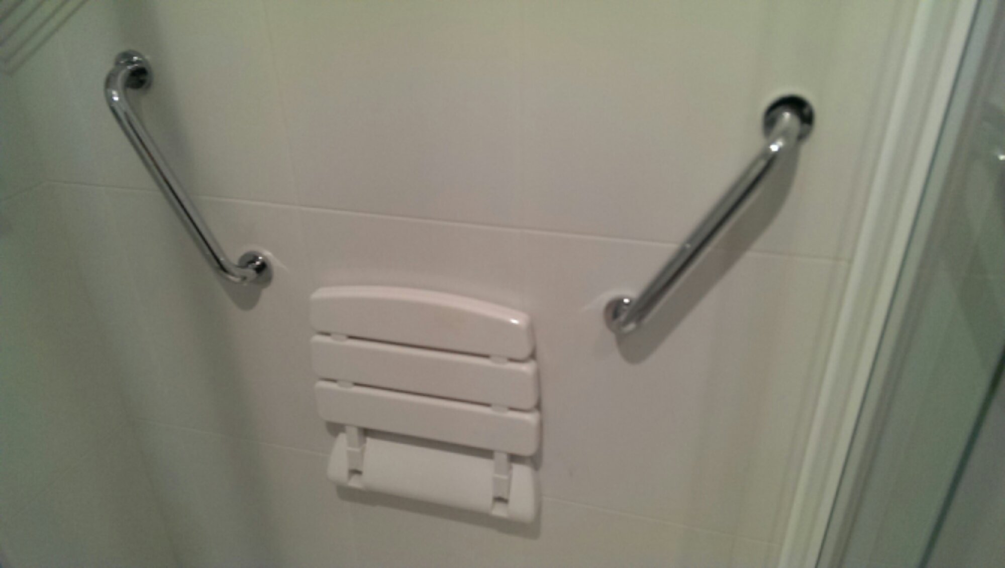 En el plato de ducha hemos instalado un asiento plegable y dos asideros al haber una persona mayor que lo necesita.