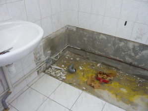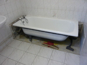 En este caso, se trata de quitar la bañera, normalmente de hierro, con lo cual quedan las 2 ó 3 paredes de detrás sin revestimiento, suele ser azulejo.