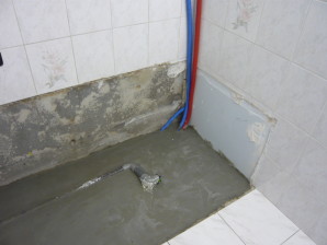 Una vez retirada la bañera y azulejos, hay que reformar el desague para la válvula del plato, y según el estado de las tuberías, si son antiguas de hierro y están muy corroidas, cambiarlas por nuevas de cobre.