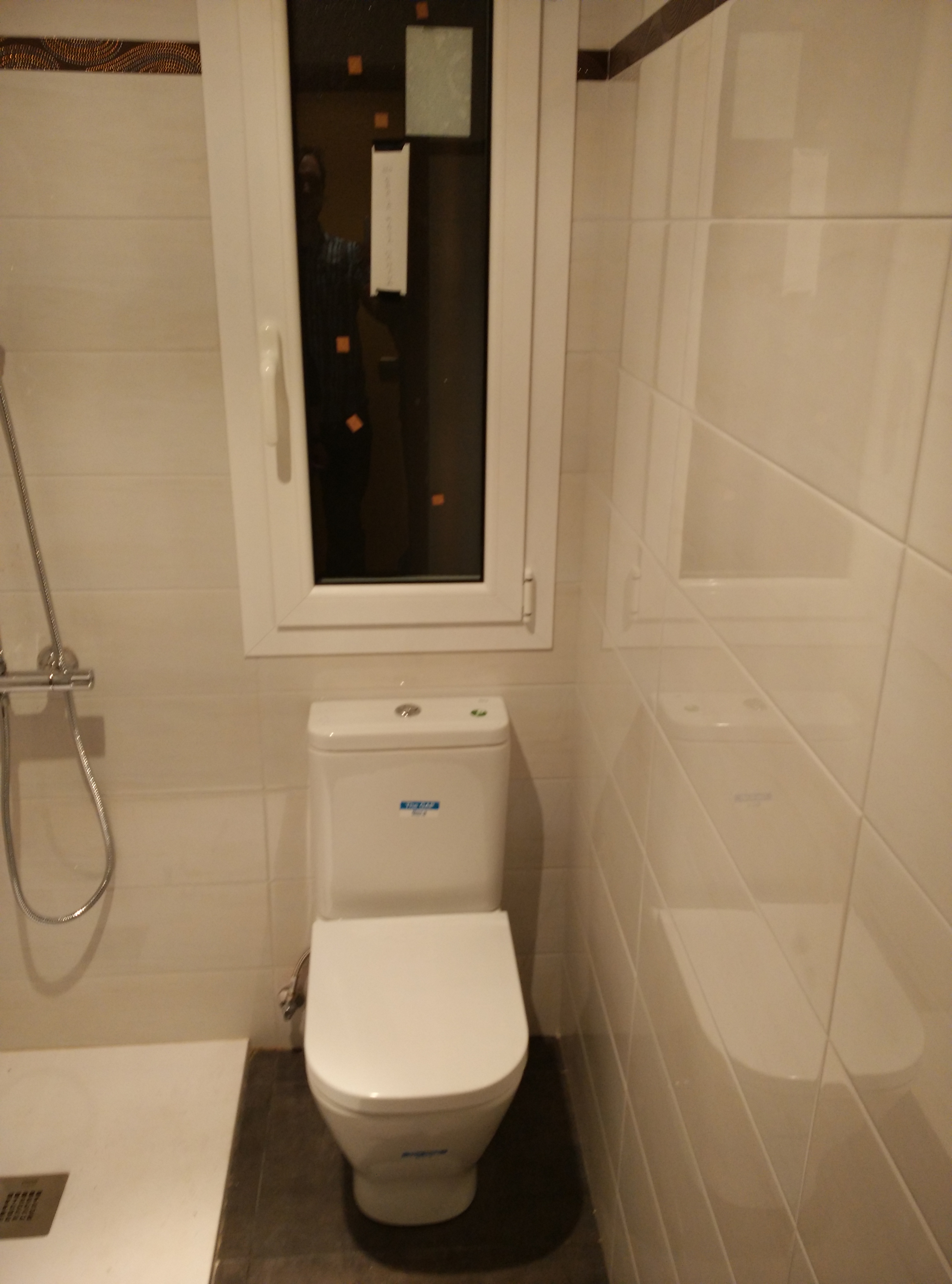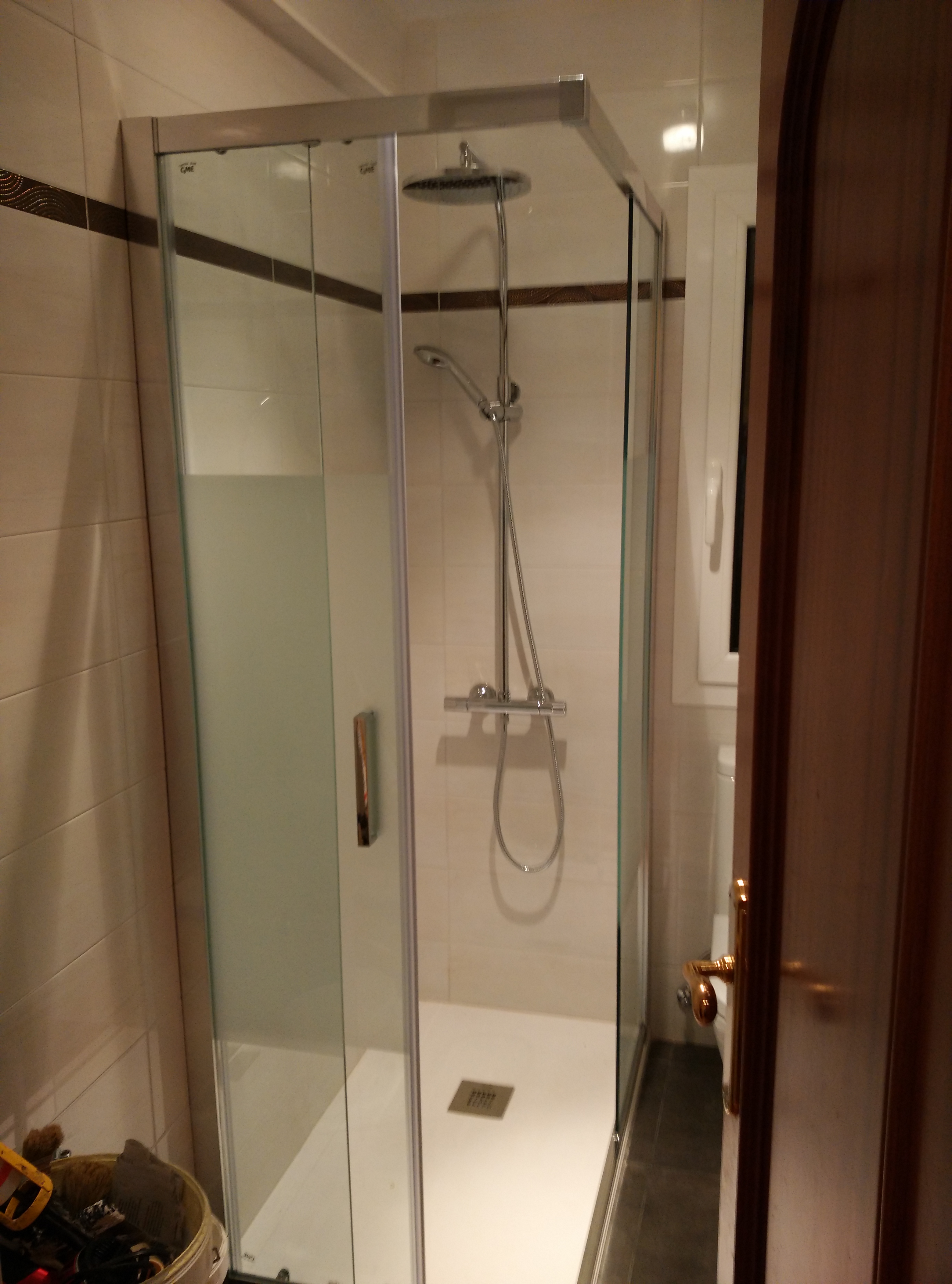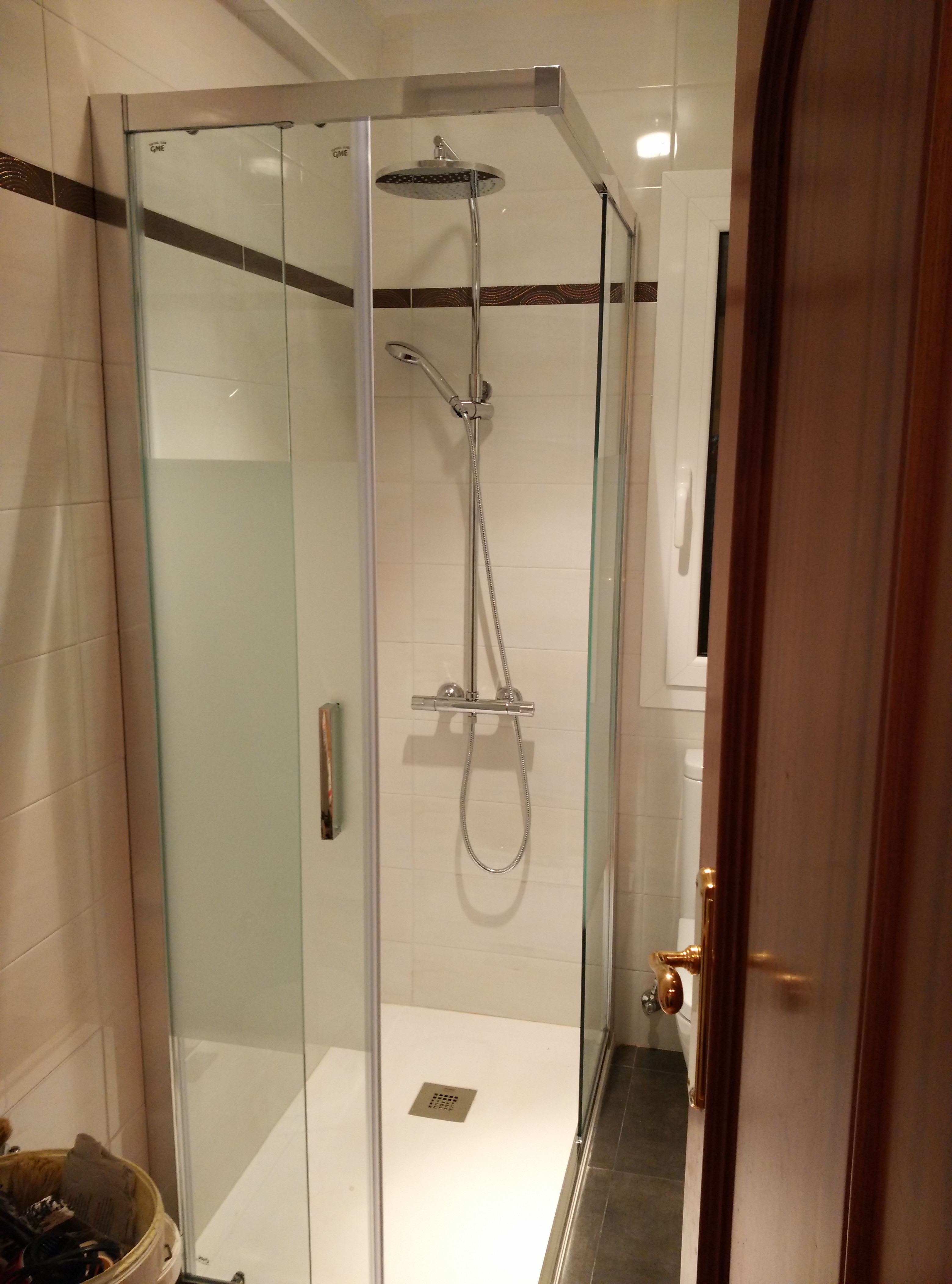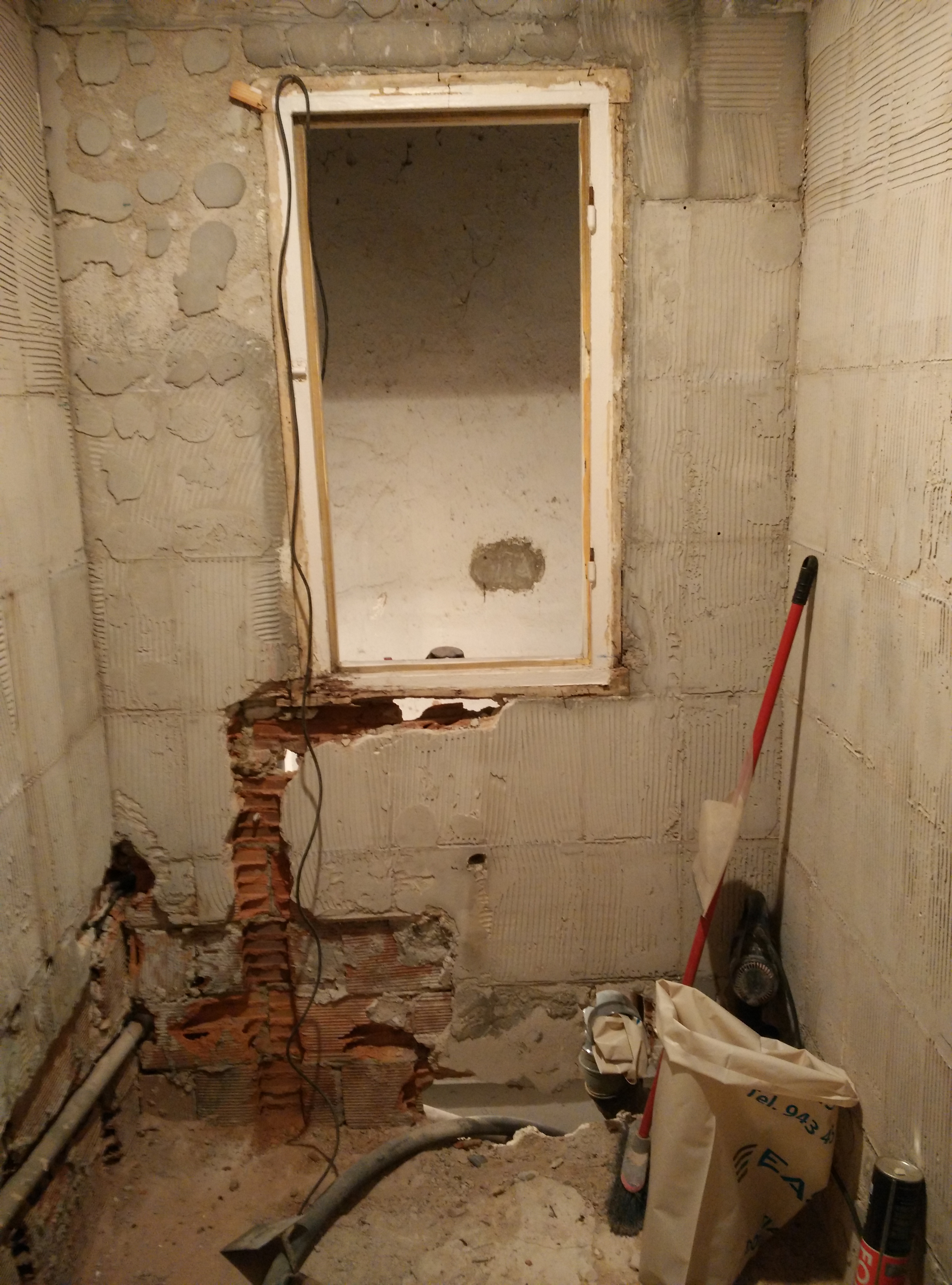 Una vez picado todo el azulejo y baldosa de suelo, y modificada la ventana, hemos cambiado toda la instalación de fontanería y electricidad, y después raseado todas las paredes e instalado el plato de 70×100 de pizarra blanco.