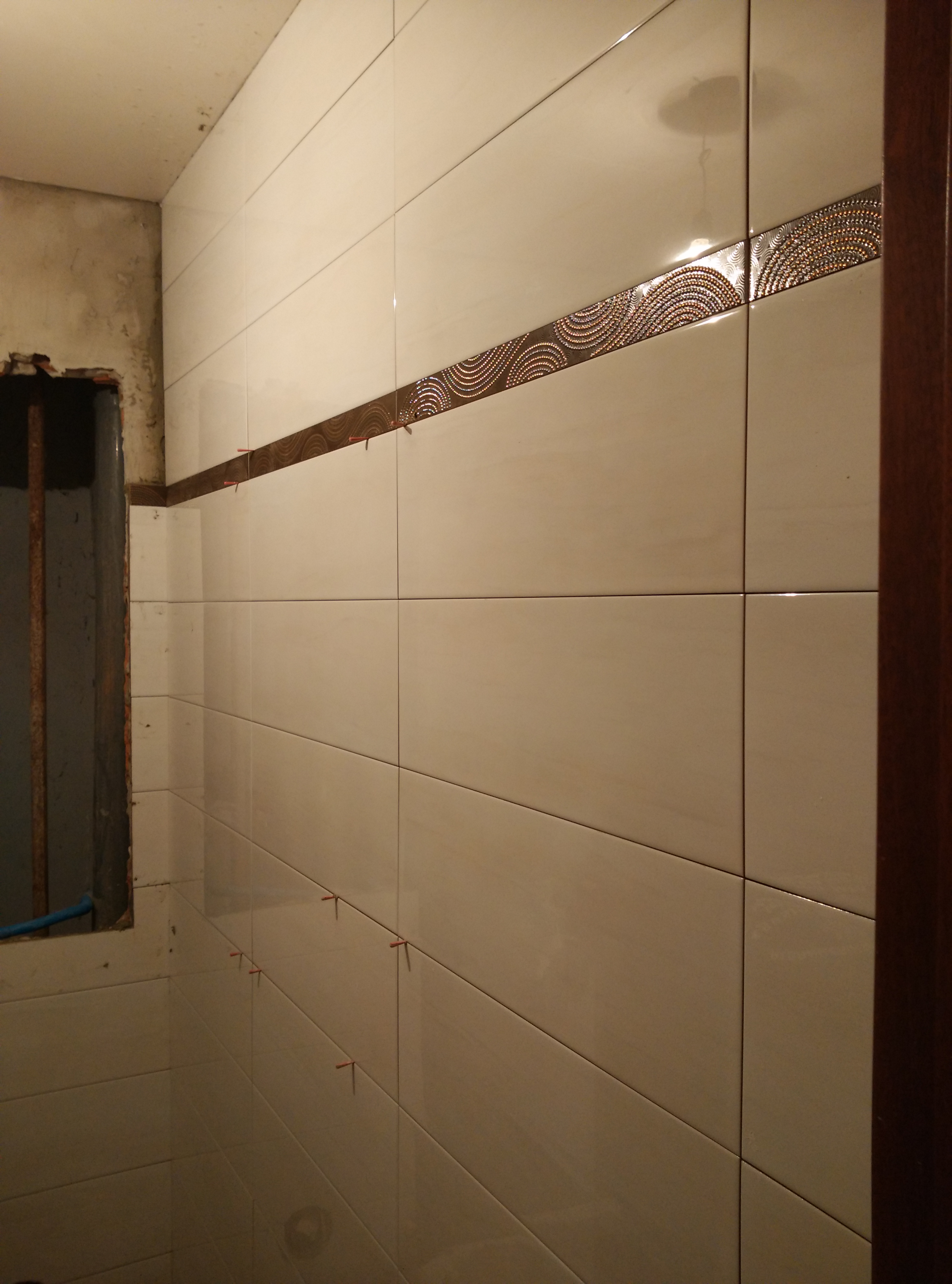 El azulejo elegido es de 20×60 color marfíl, con una cenefa para colocar a 1,80m, y el suelo un gres porcelánico de 40×60 griss claro.