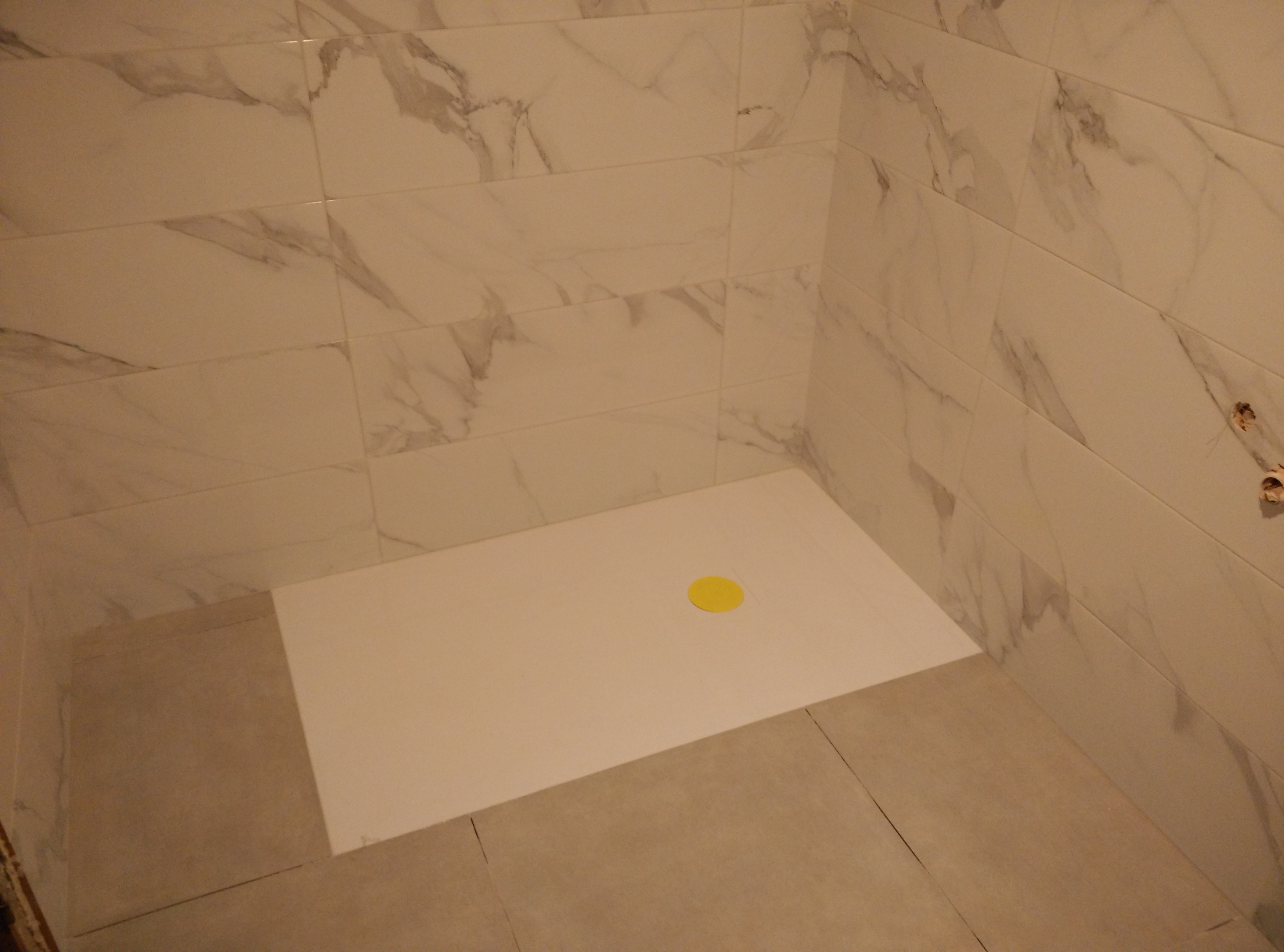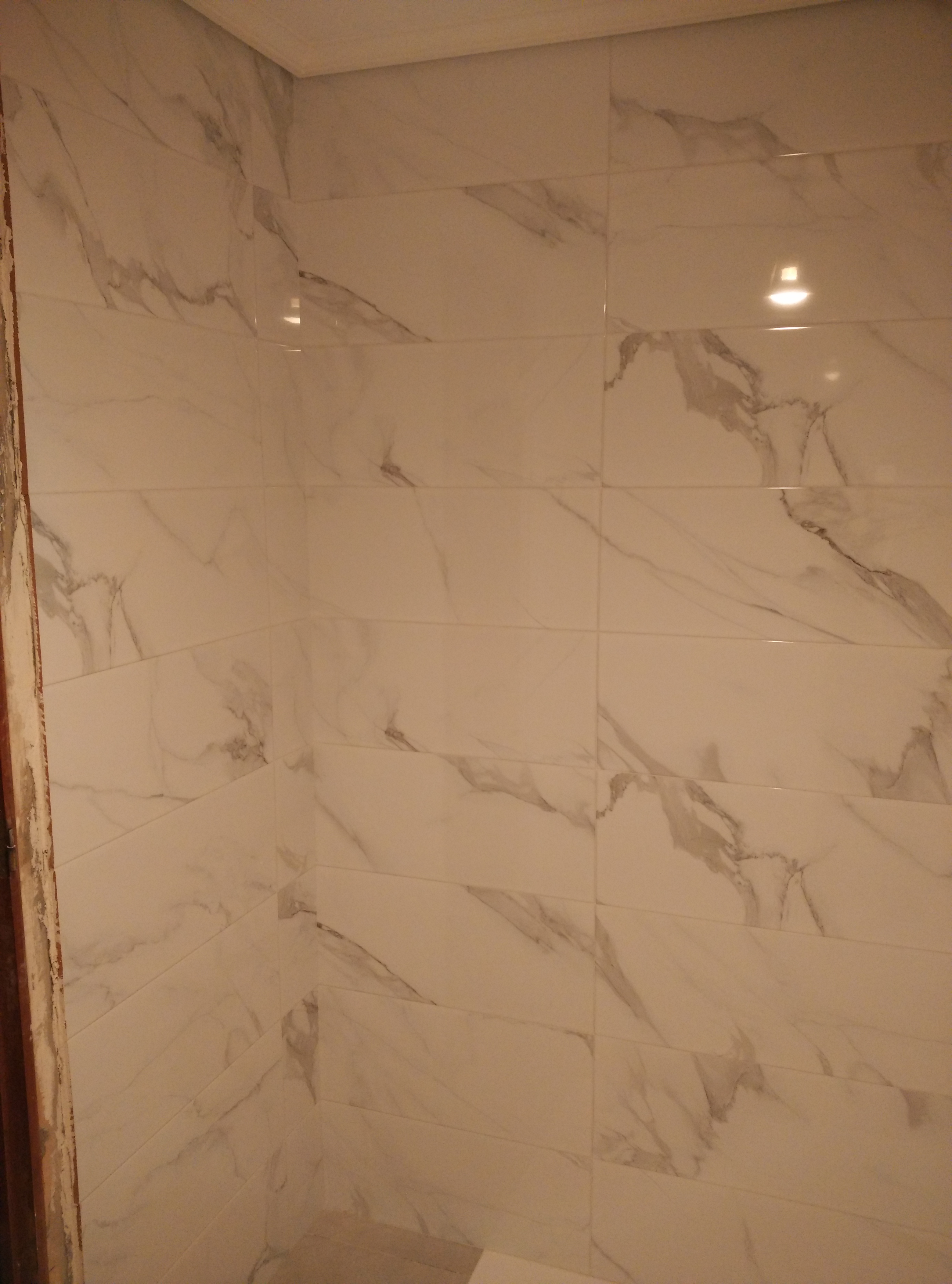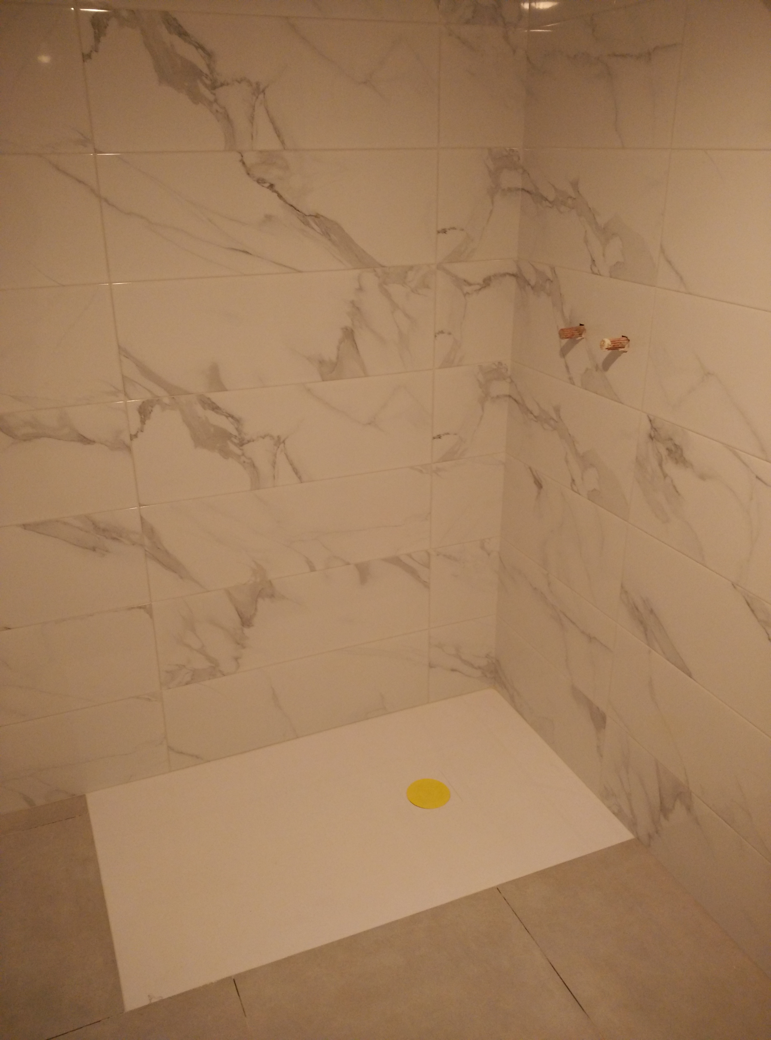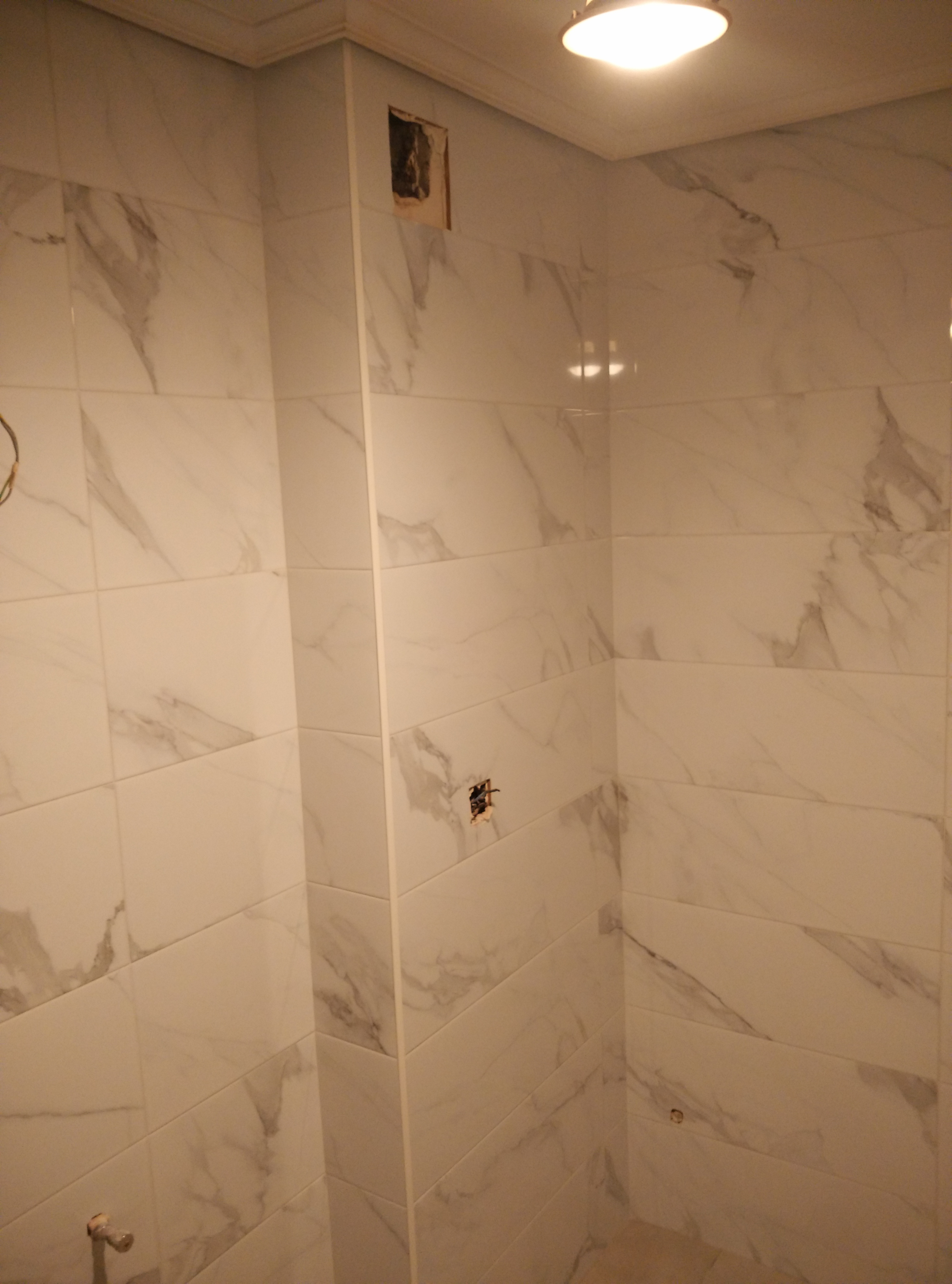 Después hay que revestir las paredes con azulejo marmoleado de 25x75cm. y el suelo con baldosa porcelánica de 50x50cm.