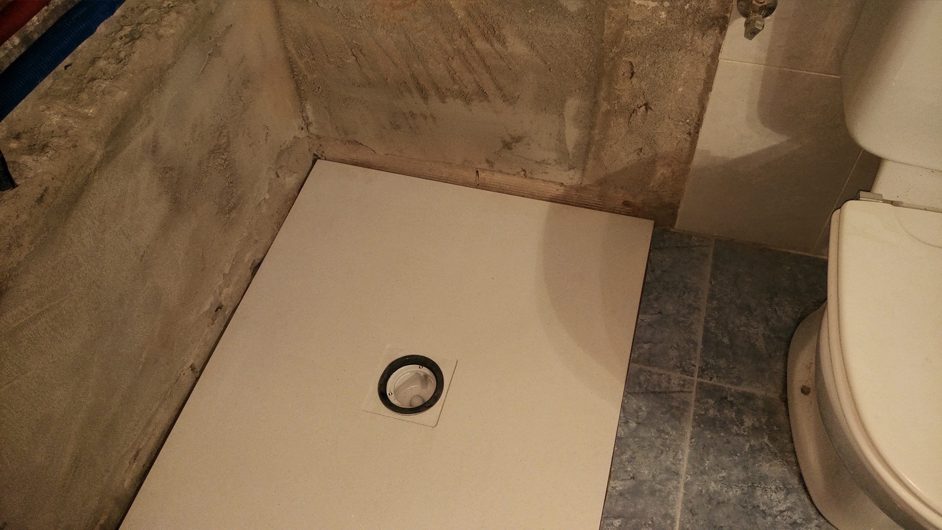 Una vez hecha la «cama» o base para el plato, y modificado el desagüe de la bañera por el de la ducha, encolamos y colocamos el plato.