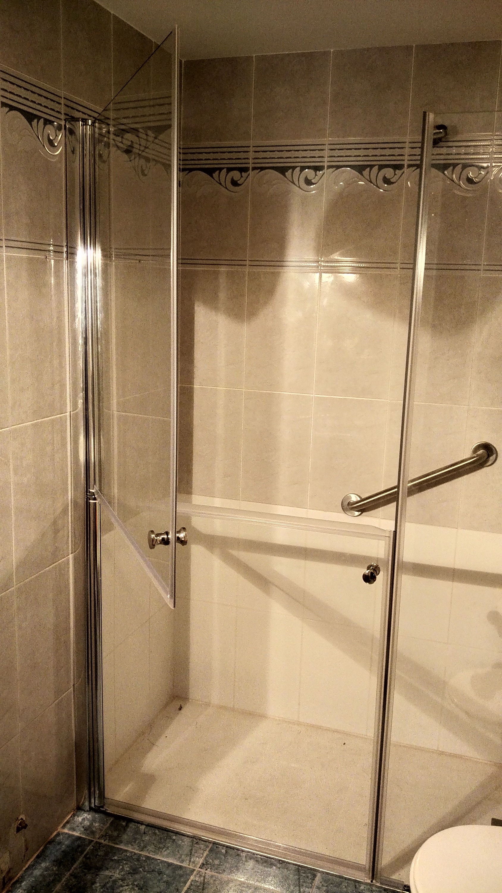 Es una mampara especial, de minusvalía, con el lado derecho fijo, y una puerta doble abatible en el lado izquierdo para poder duchar a alguien desde fuera.
