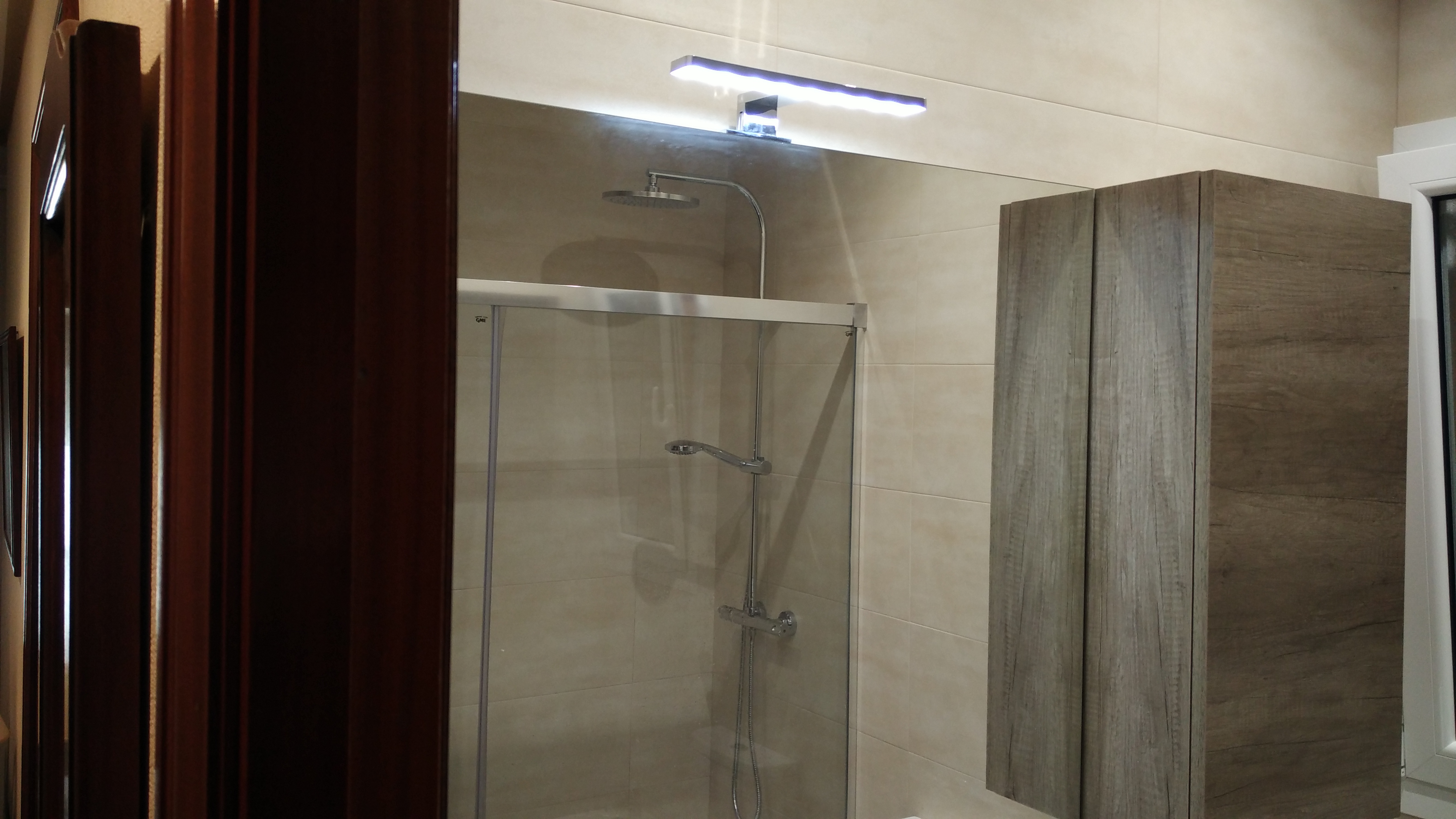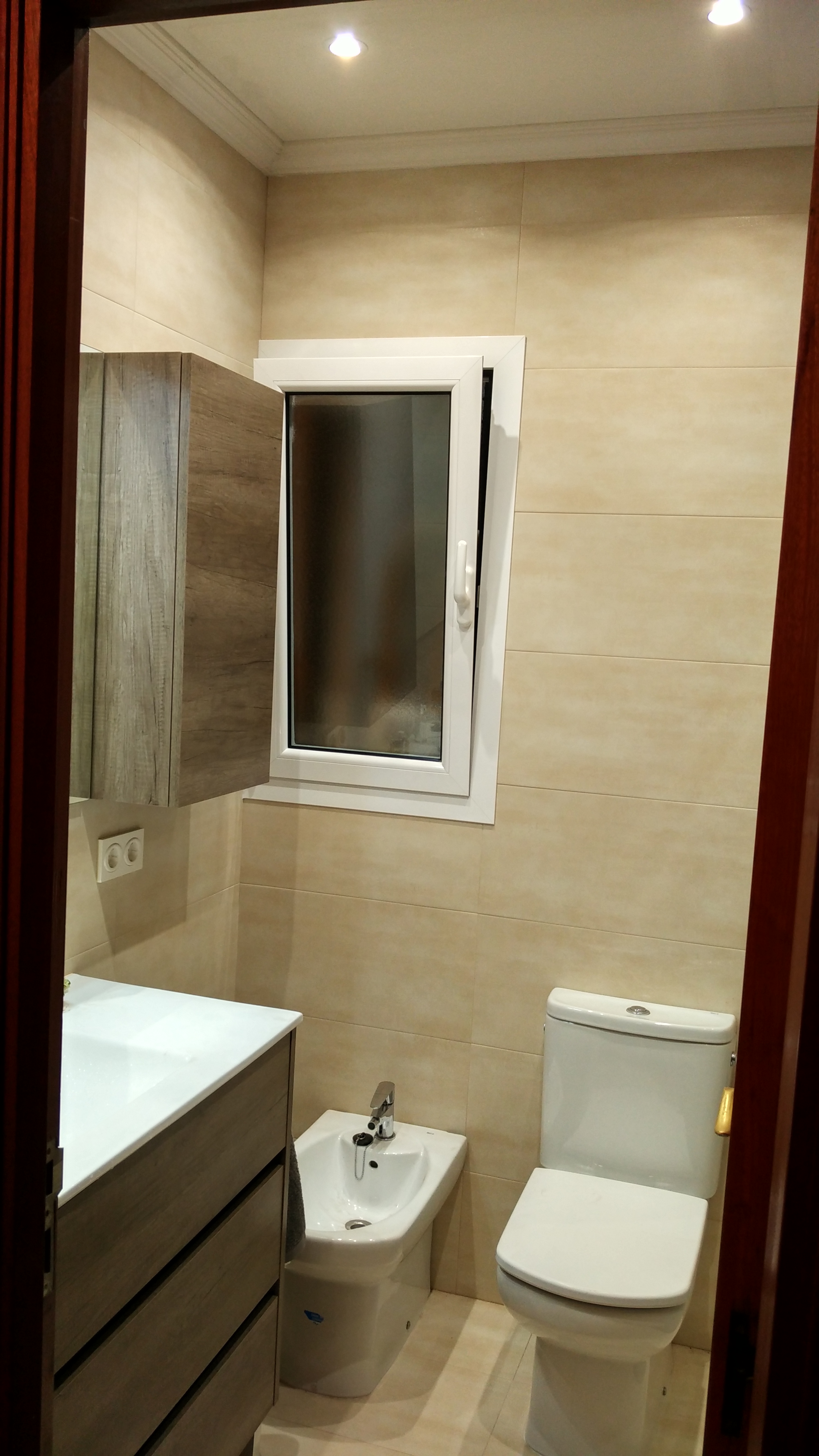 Ya sólo queda colocar inodoro, bidé, el mueble de baño de 100cms con 3 cajones, las griferías, espejo con aplique led y mampara de ducha.