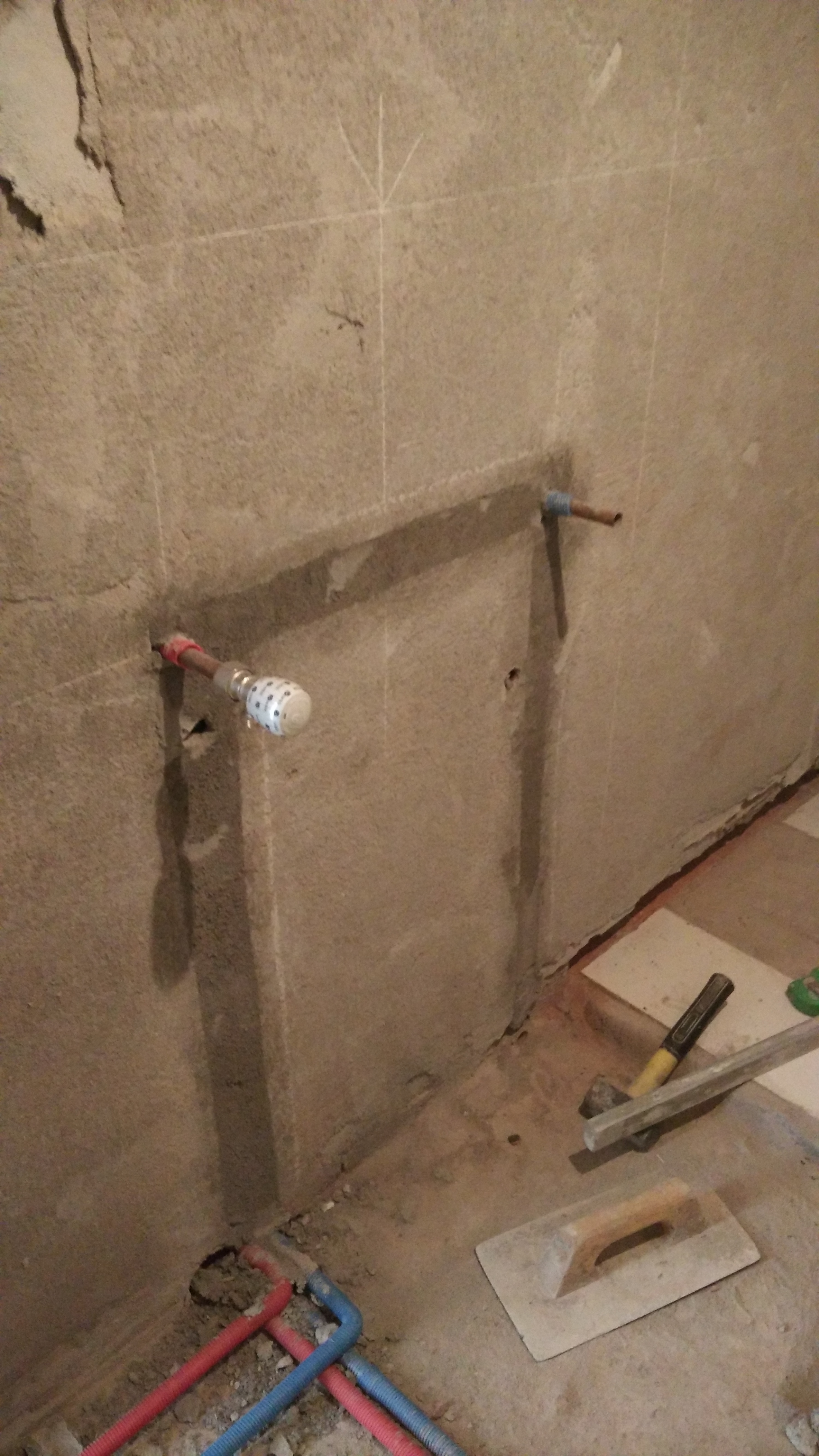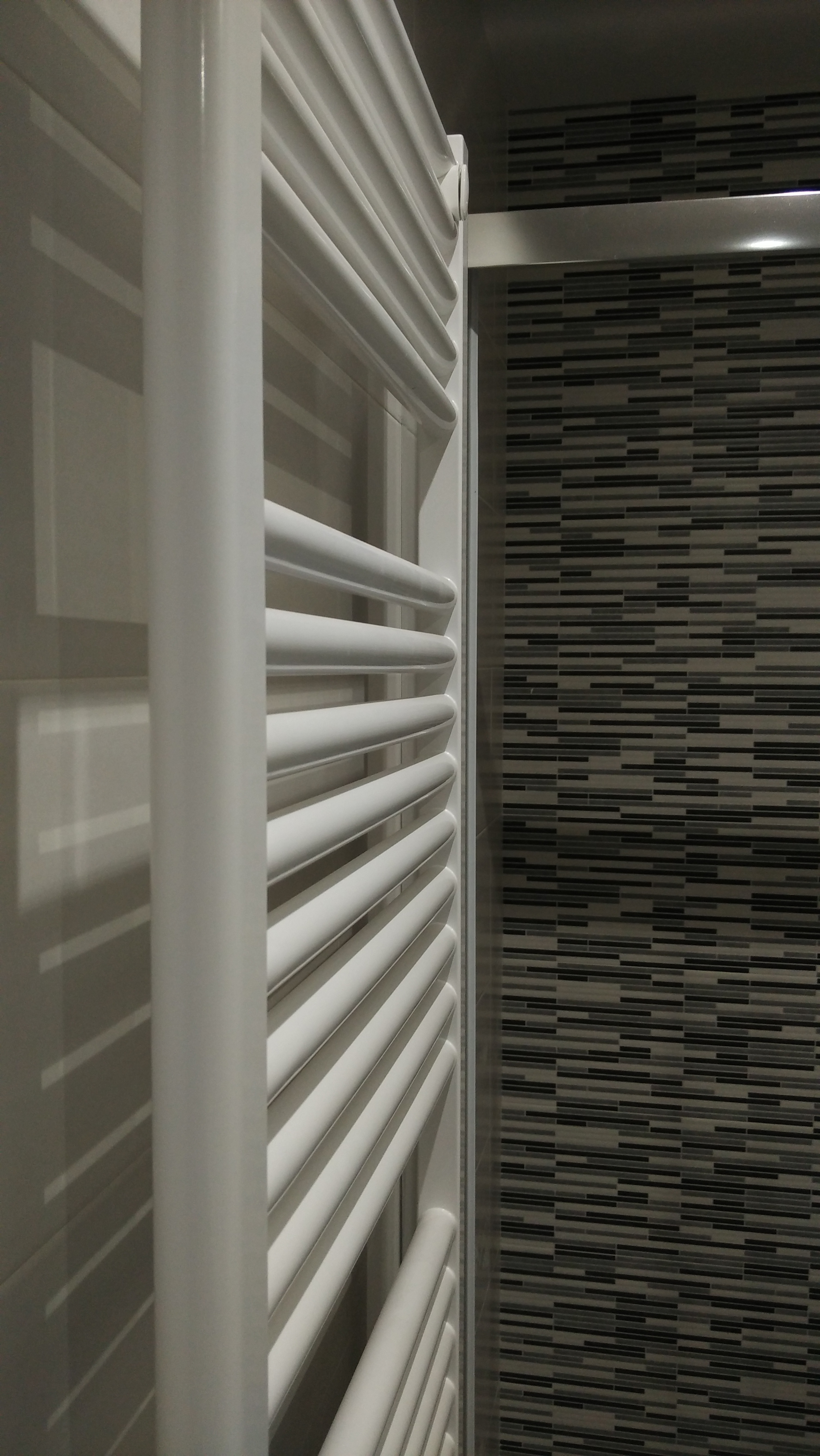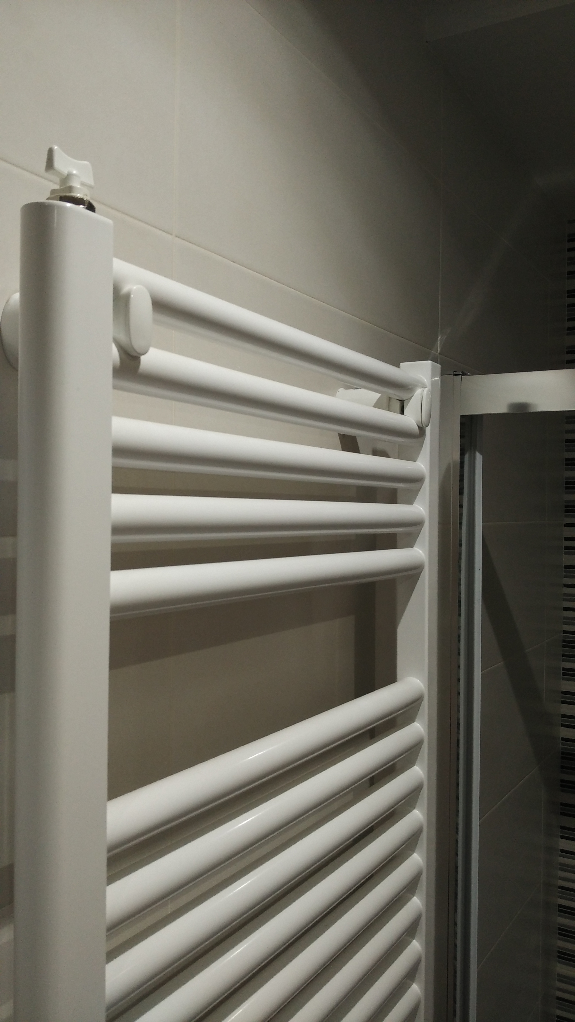 El pequeño radiador de calefacción se va a mover y sustituir por un radiador-toallero de 120 x 50 cm. junto a la ducha.