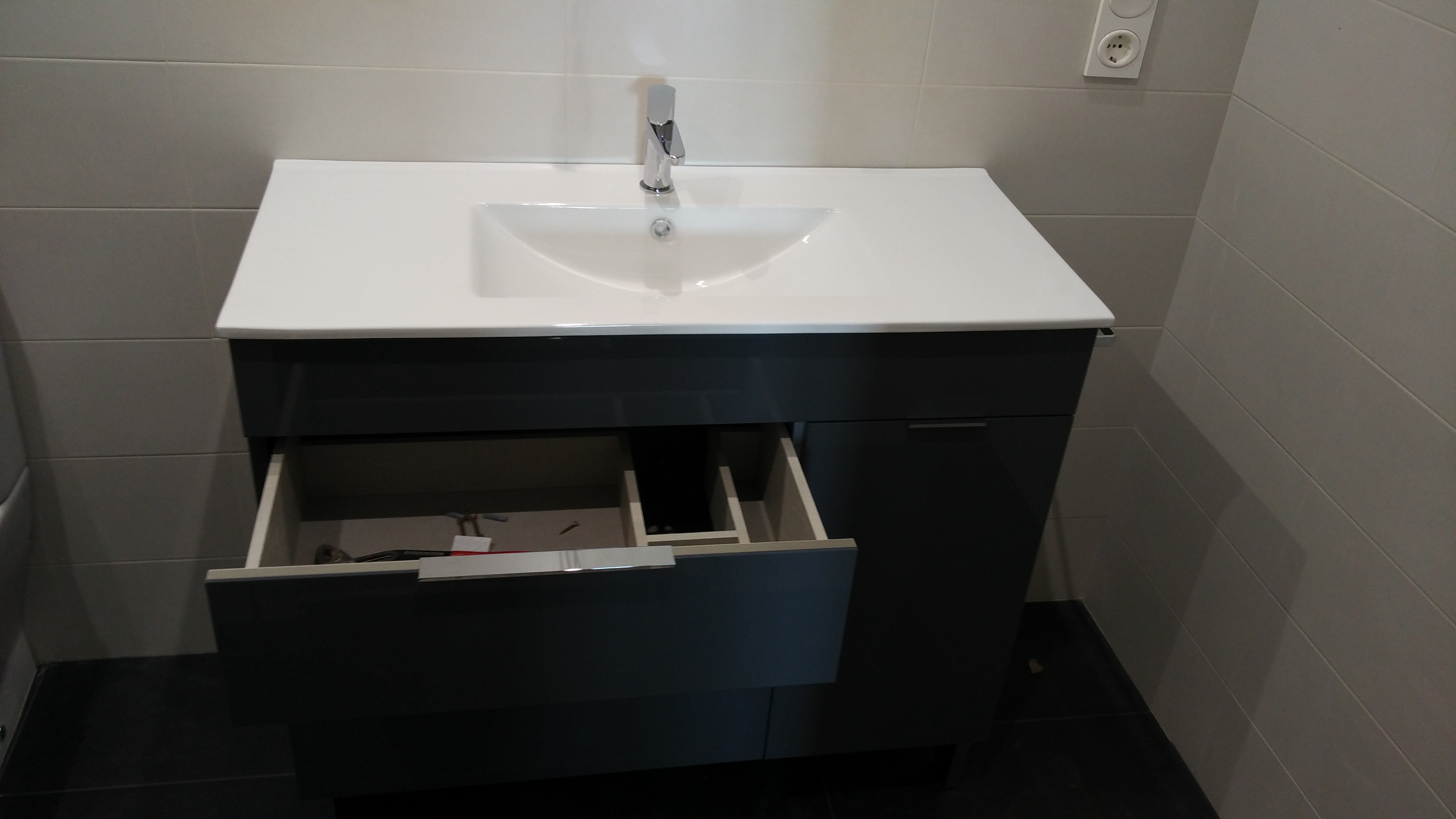 El mueble de lavabo lleva también un mueble auxiliar al suelo, y dos pequeños cubos en la pared.