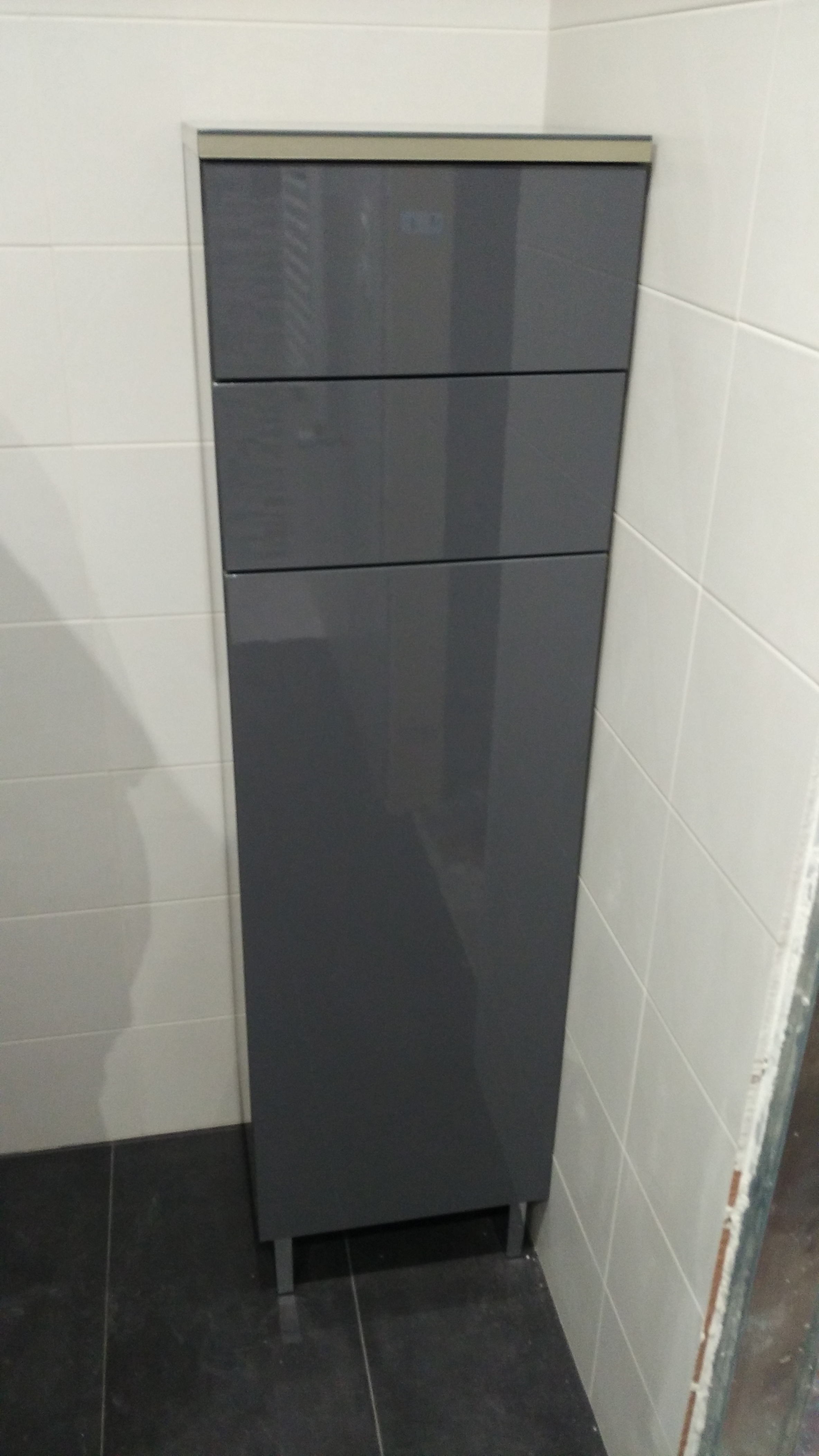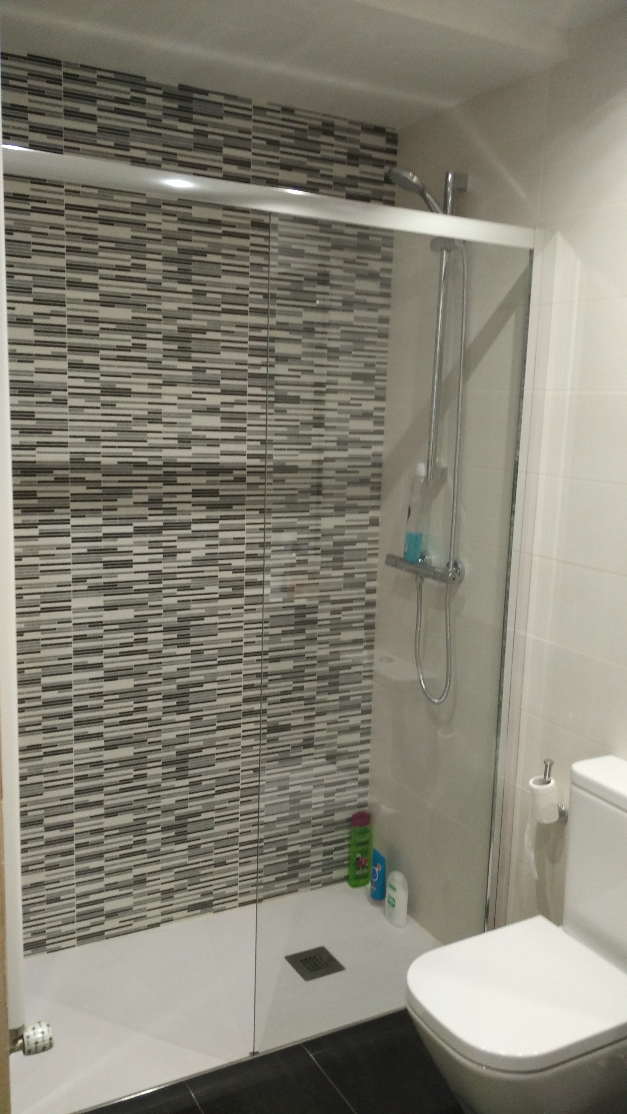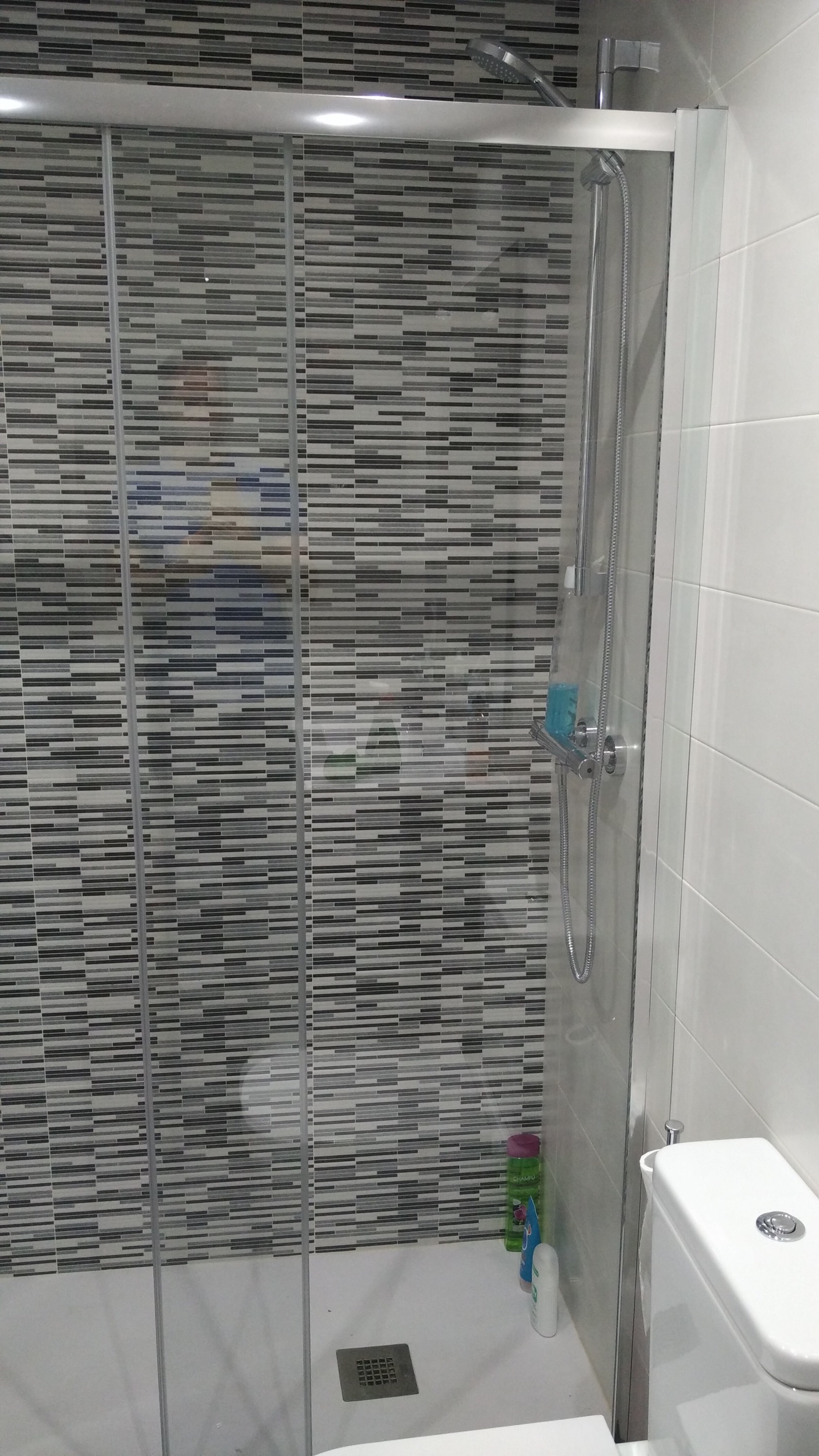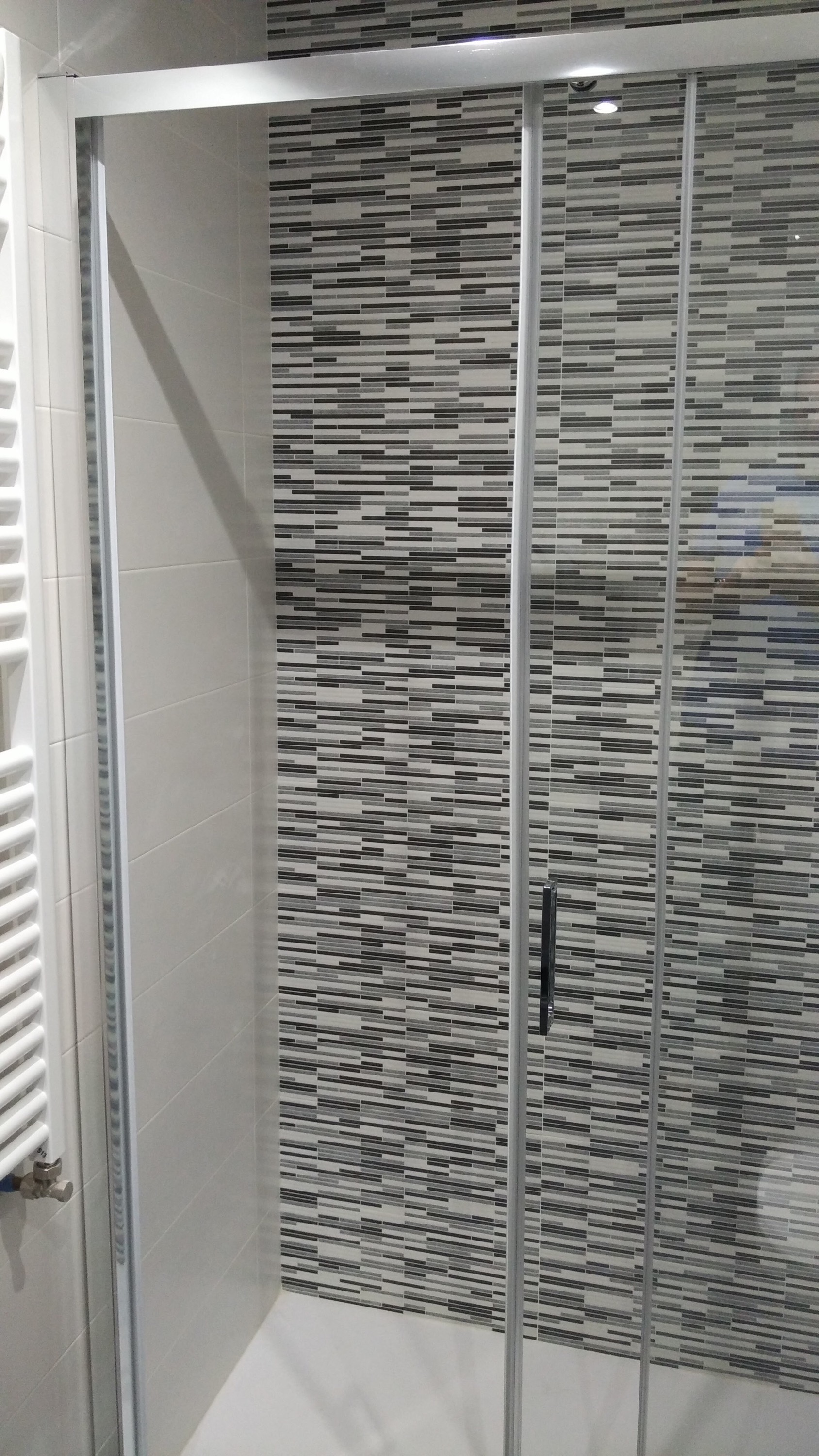 Sólo falta colocar la mampara de ducha, en este caso es un frontal con un fijo más puerta corredera, con los perfiles de aluminio cromo y cristales transparente.