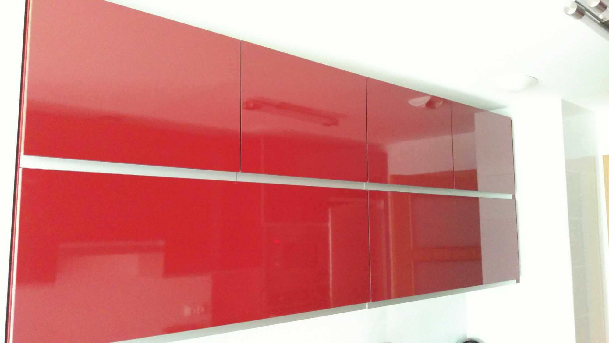 Los clientes han elegido los muebles en un precioso color cereza, con puertas sin tiradores, y una encimera de Silestone gris oscuro.
