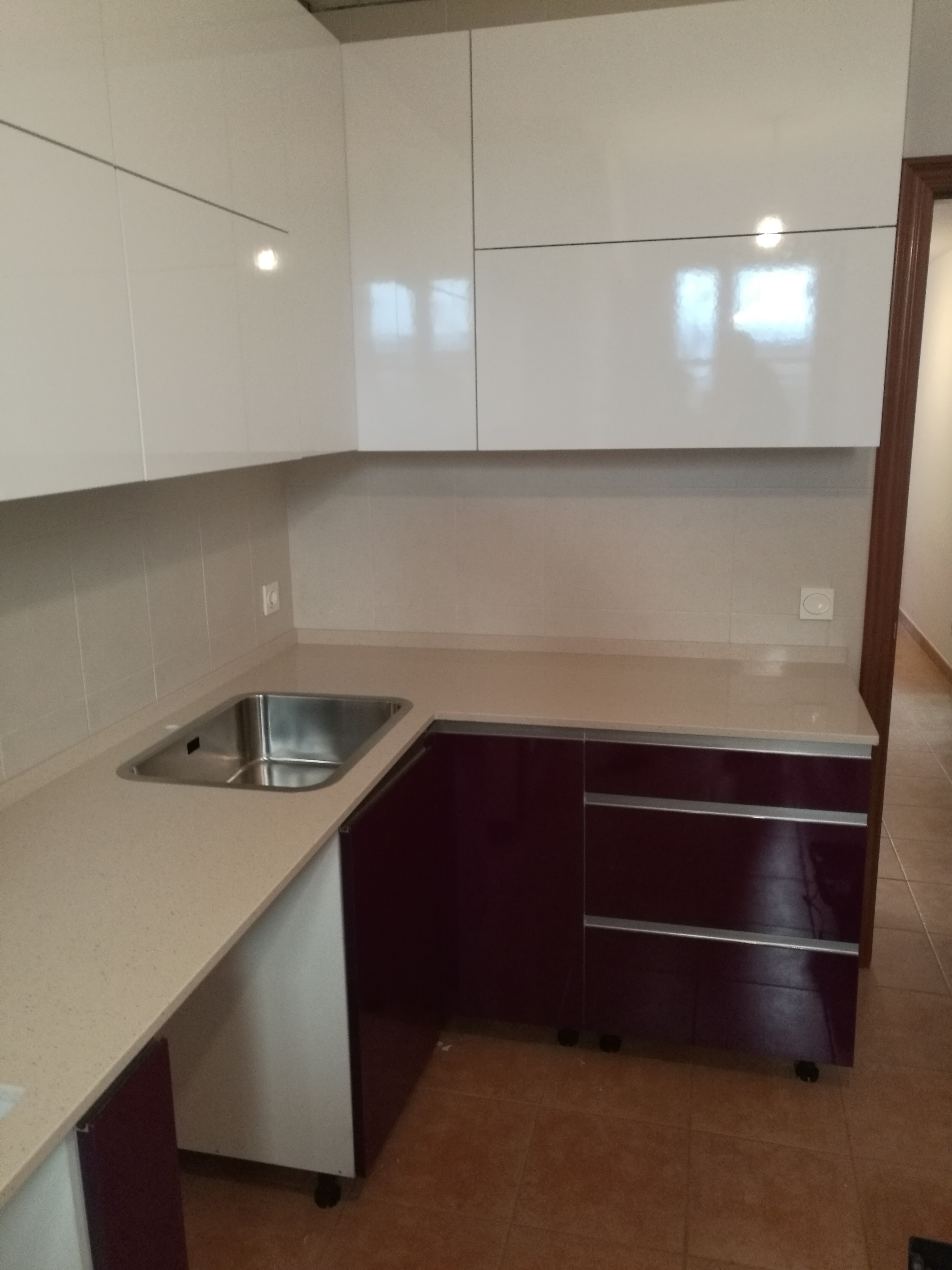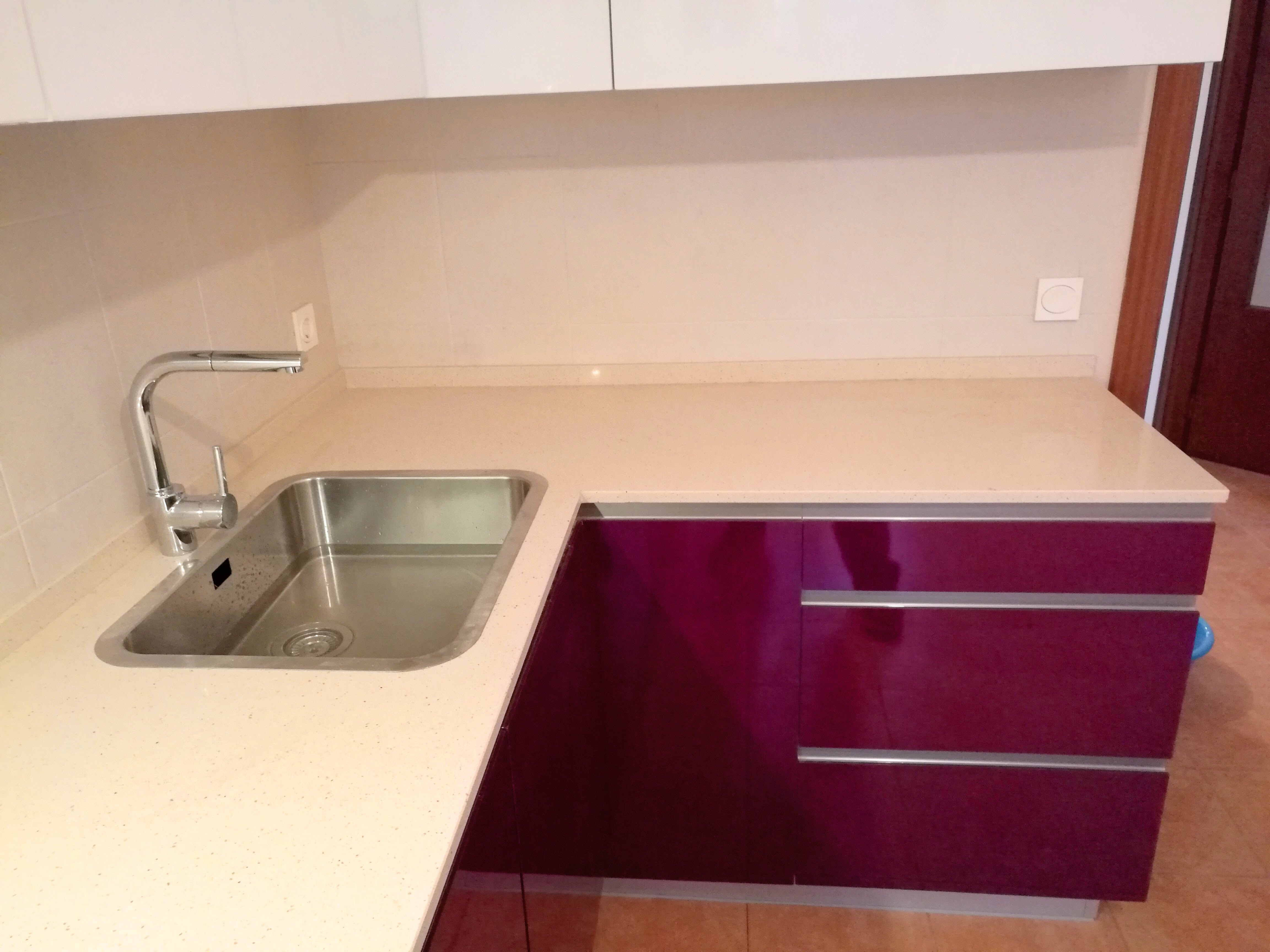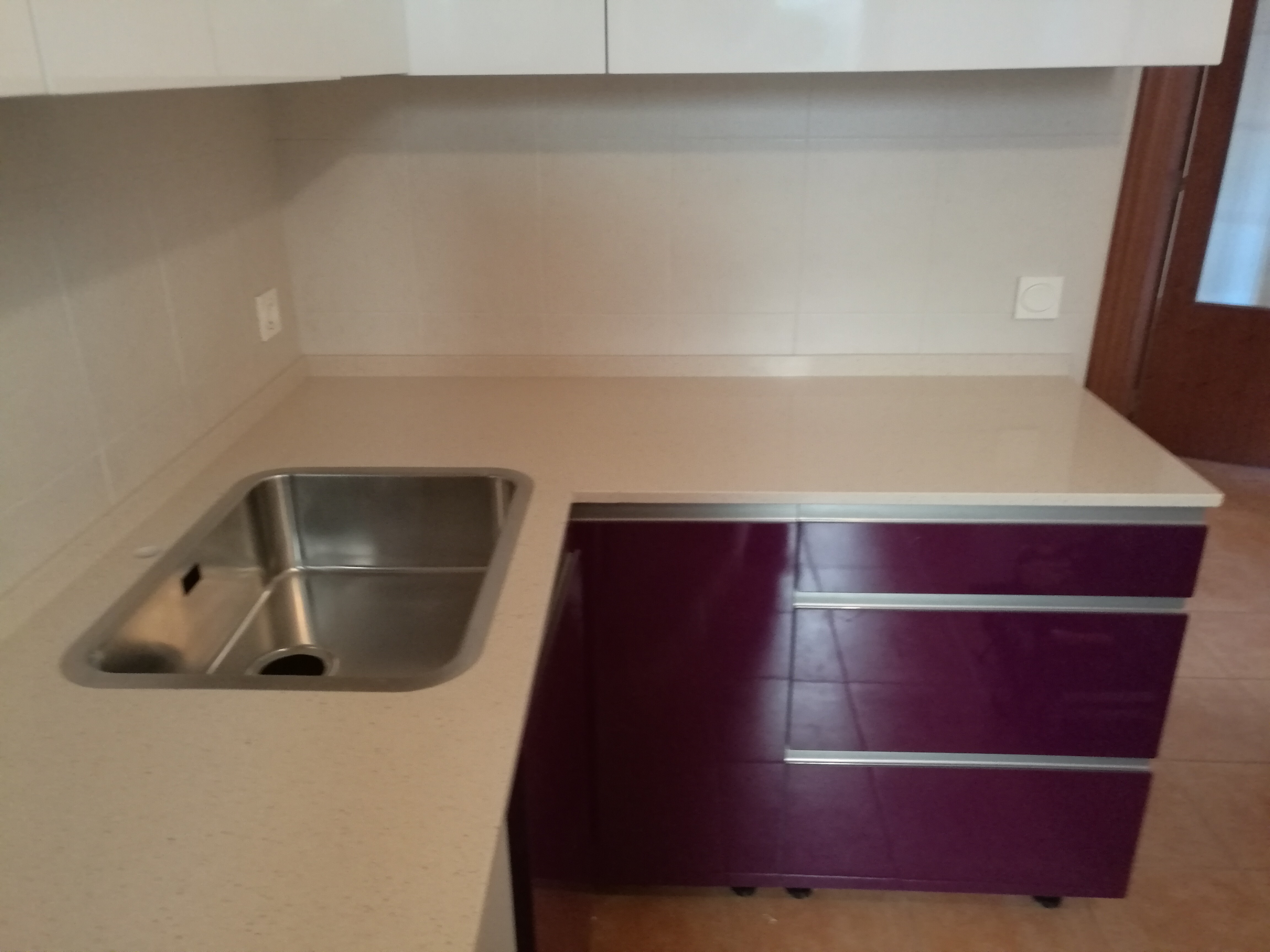 Eta horrela sukaldea erabat amaituta uzten dugu, bi koloretan dira altzariak, krema eta alberjinia, eta silestonea ere krema kolorekoa.