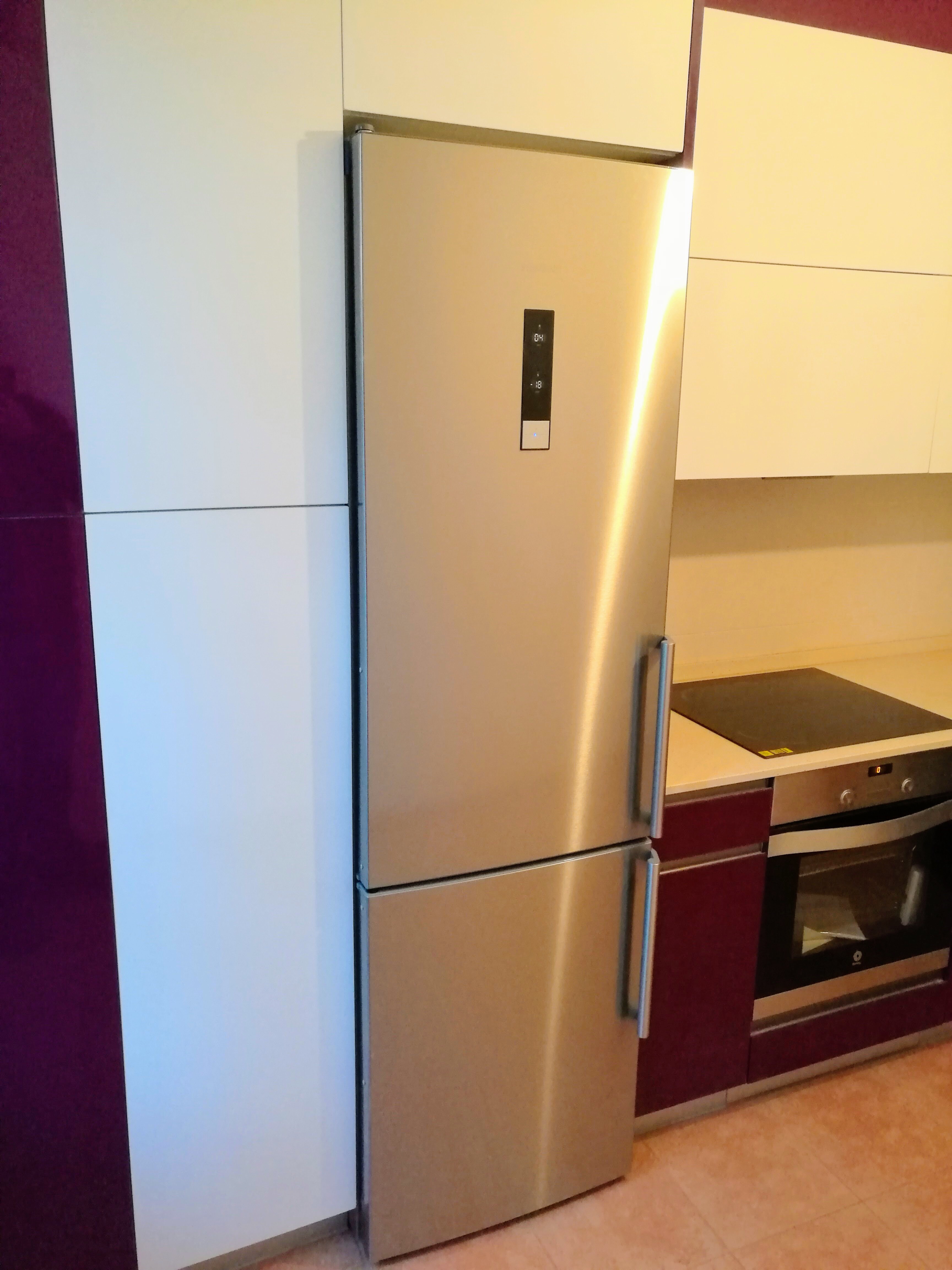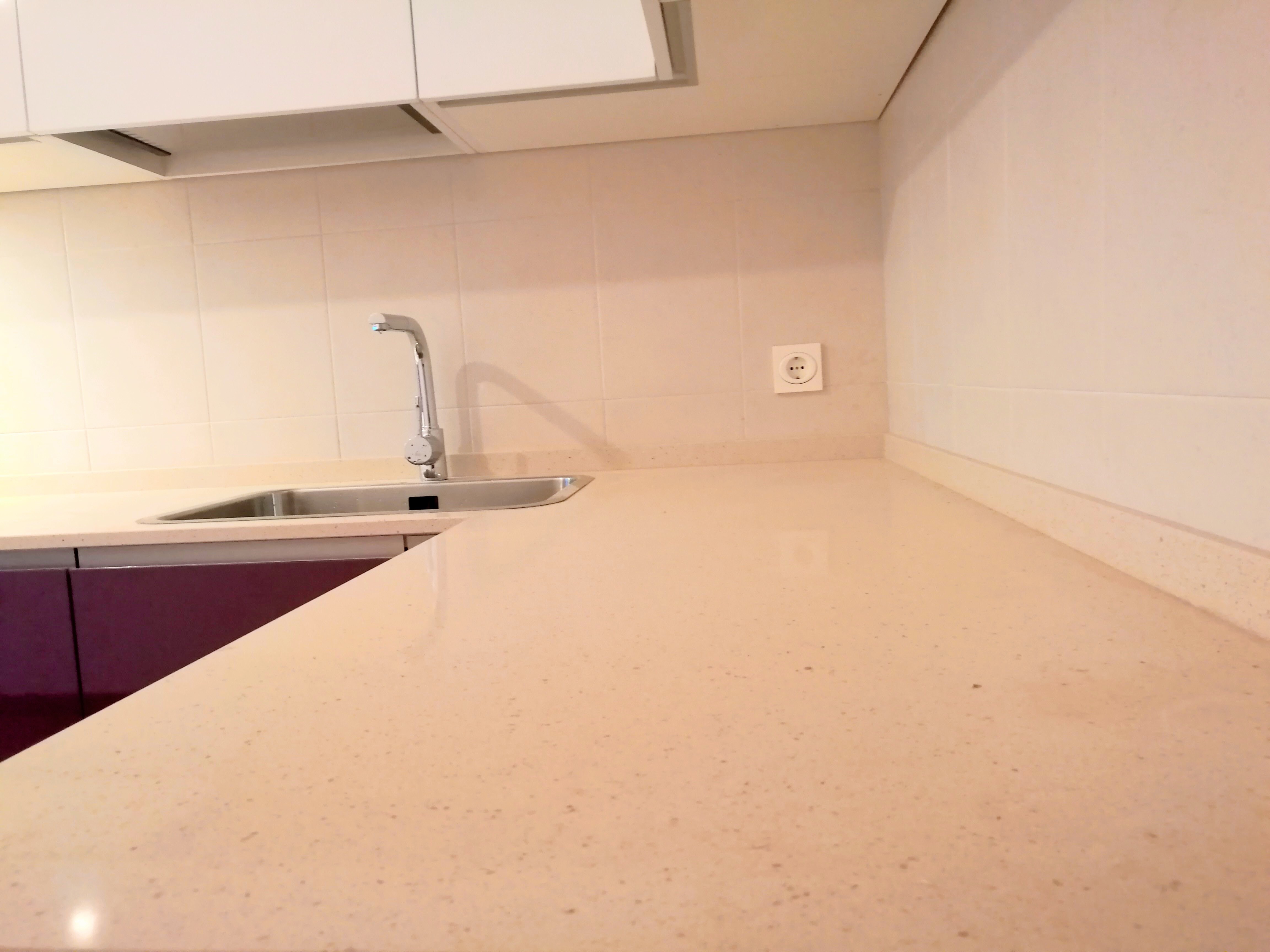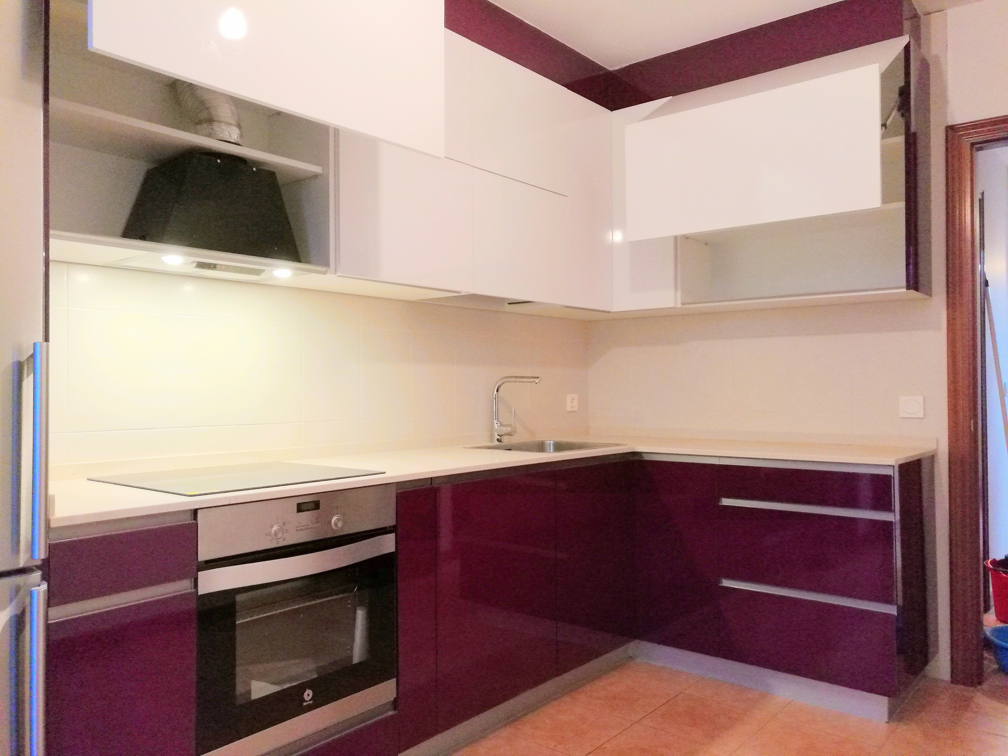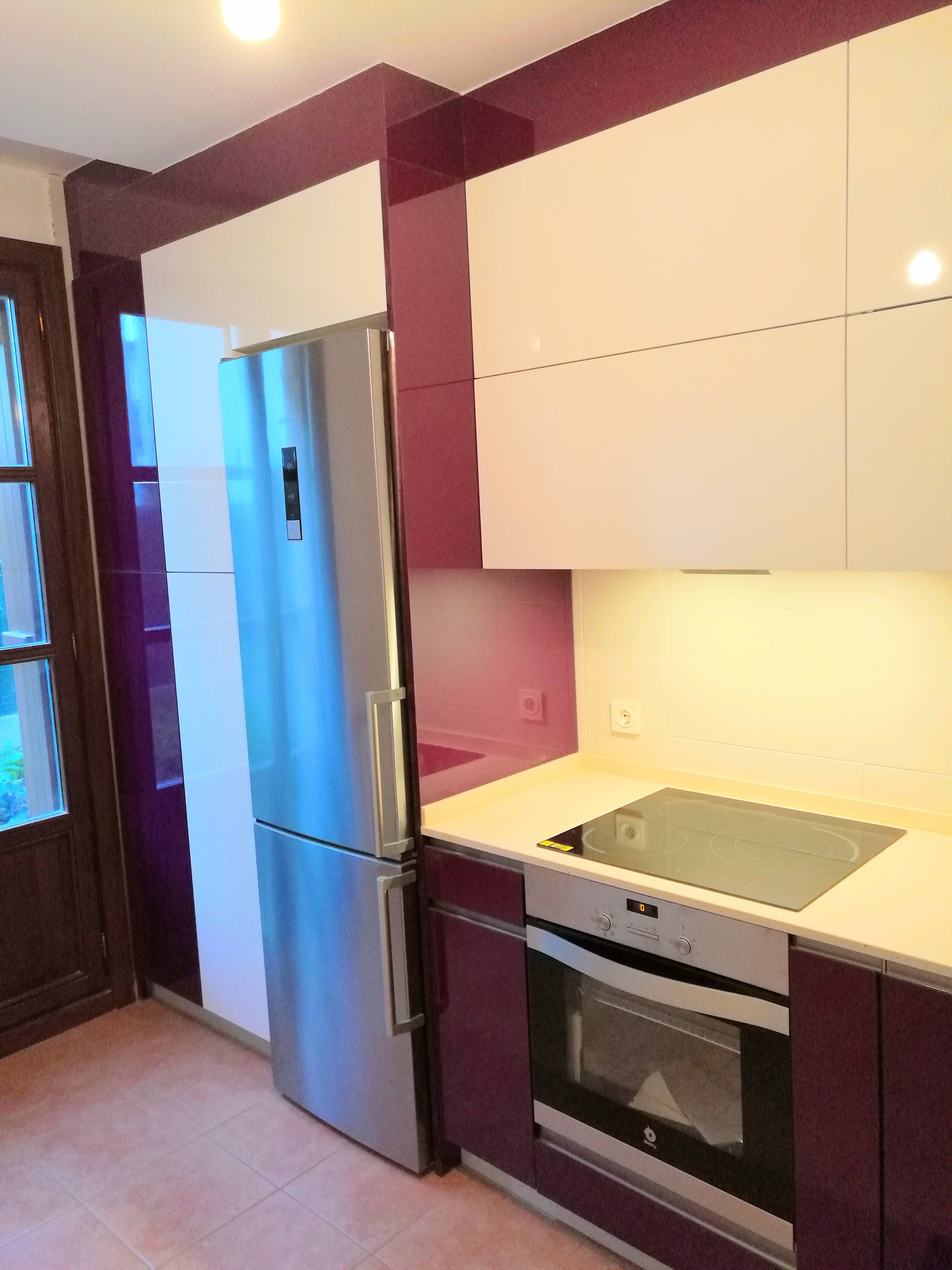 Eta horrela sukaldea erabat amaituta uzten dugu, bi koloretan dira altzariak, krema eta alberjinia, eta silestonea ere krema kolorekoa.