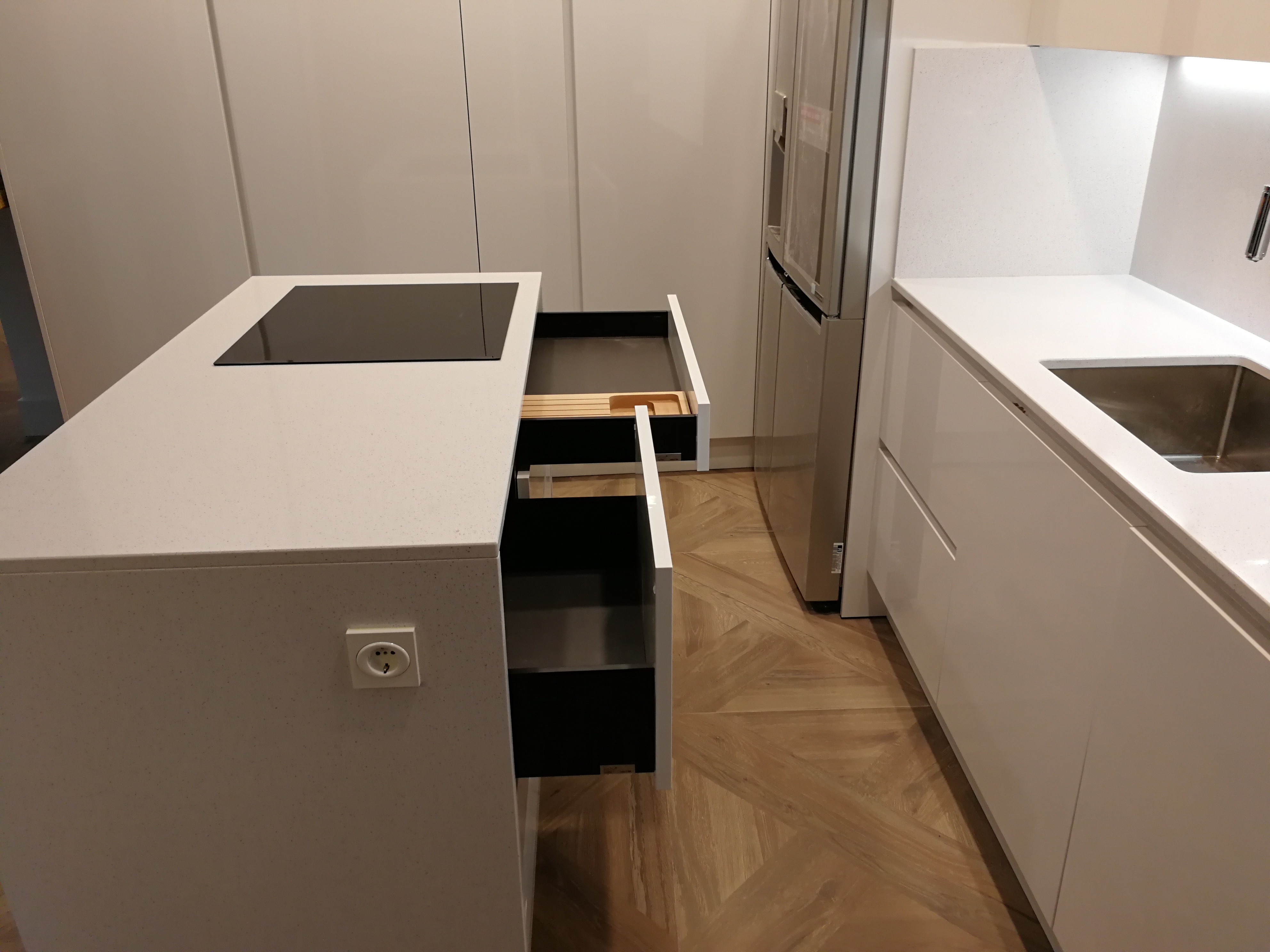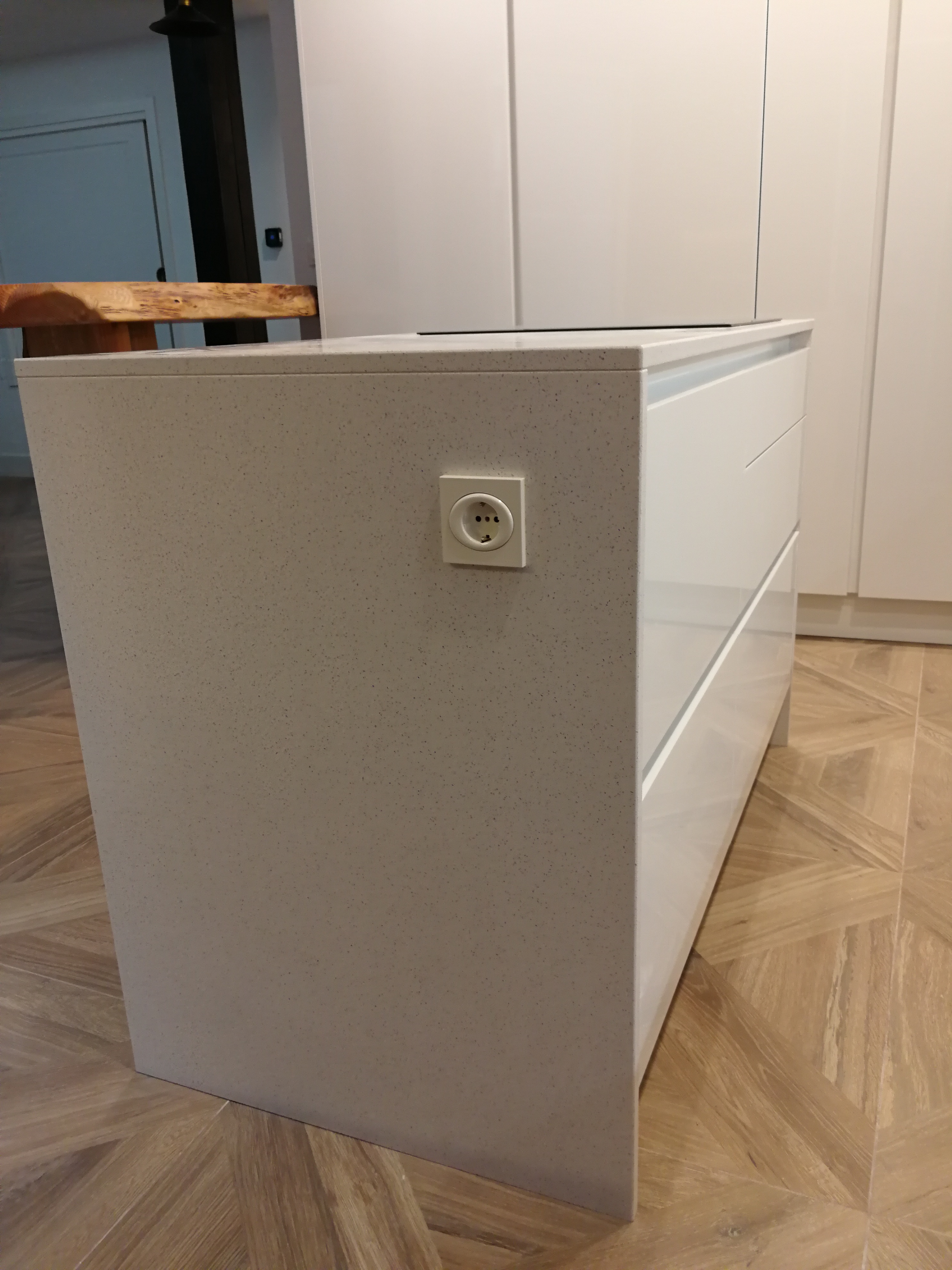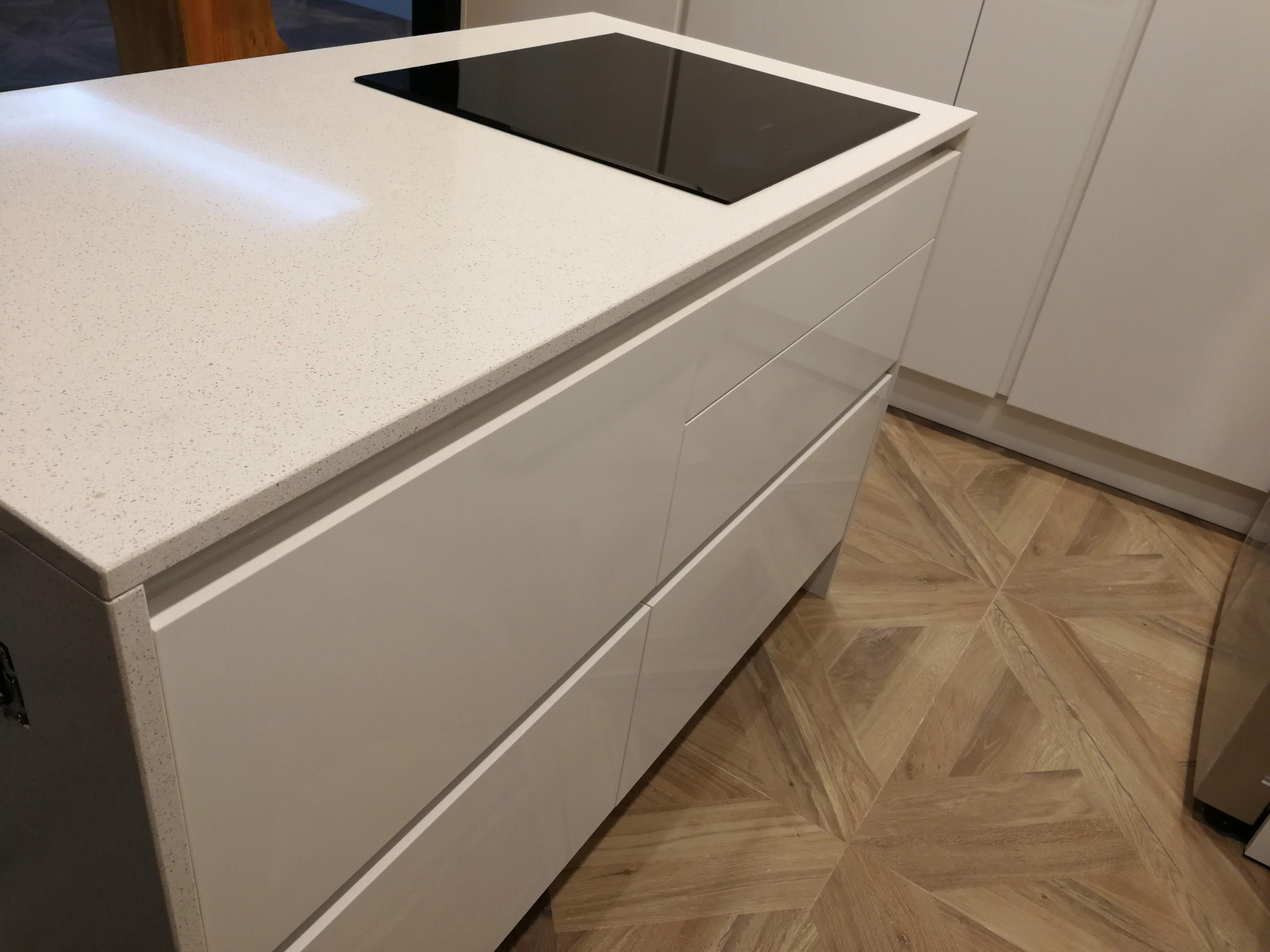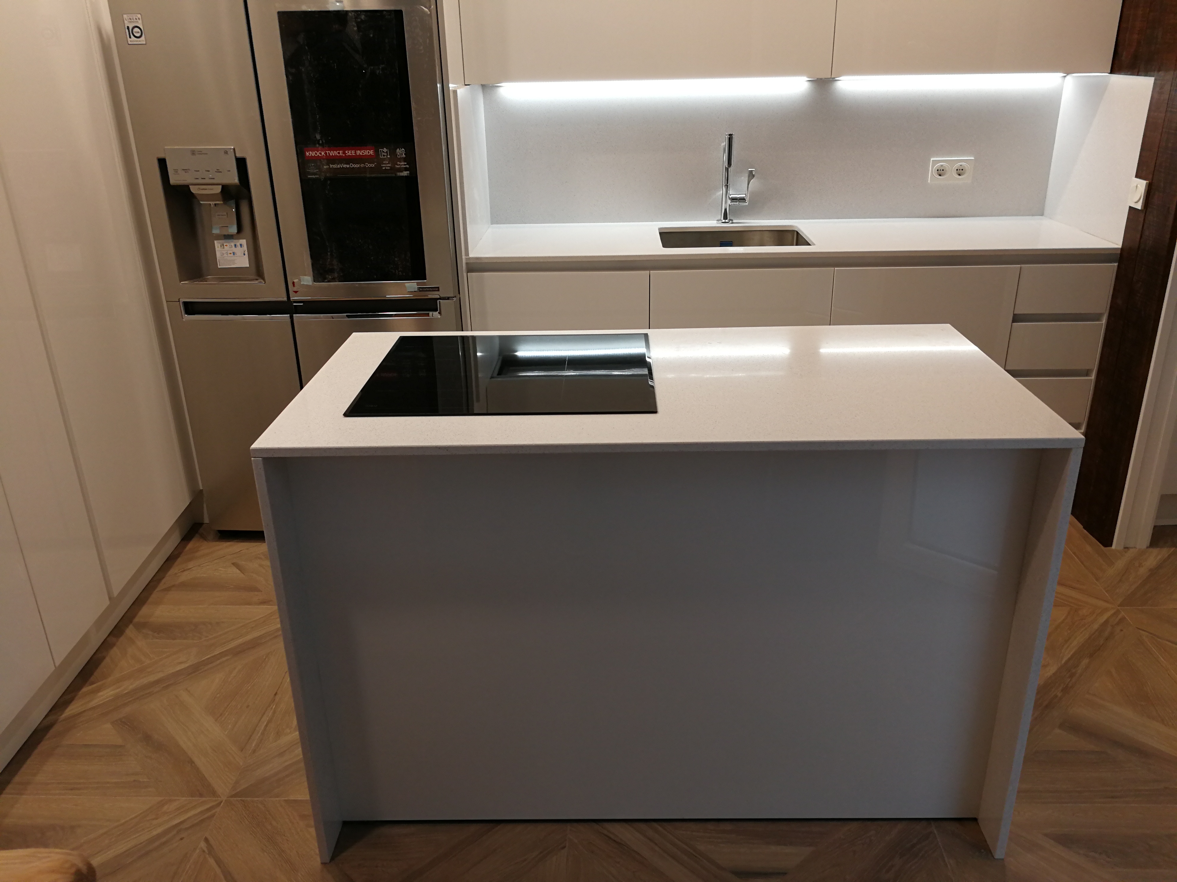 Son dos frentes de muebles color blanco con una isla central todo rematado con silestone.