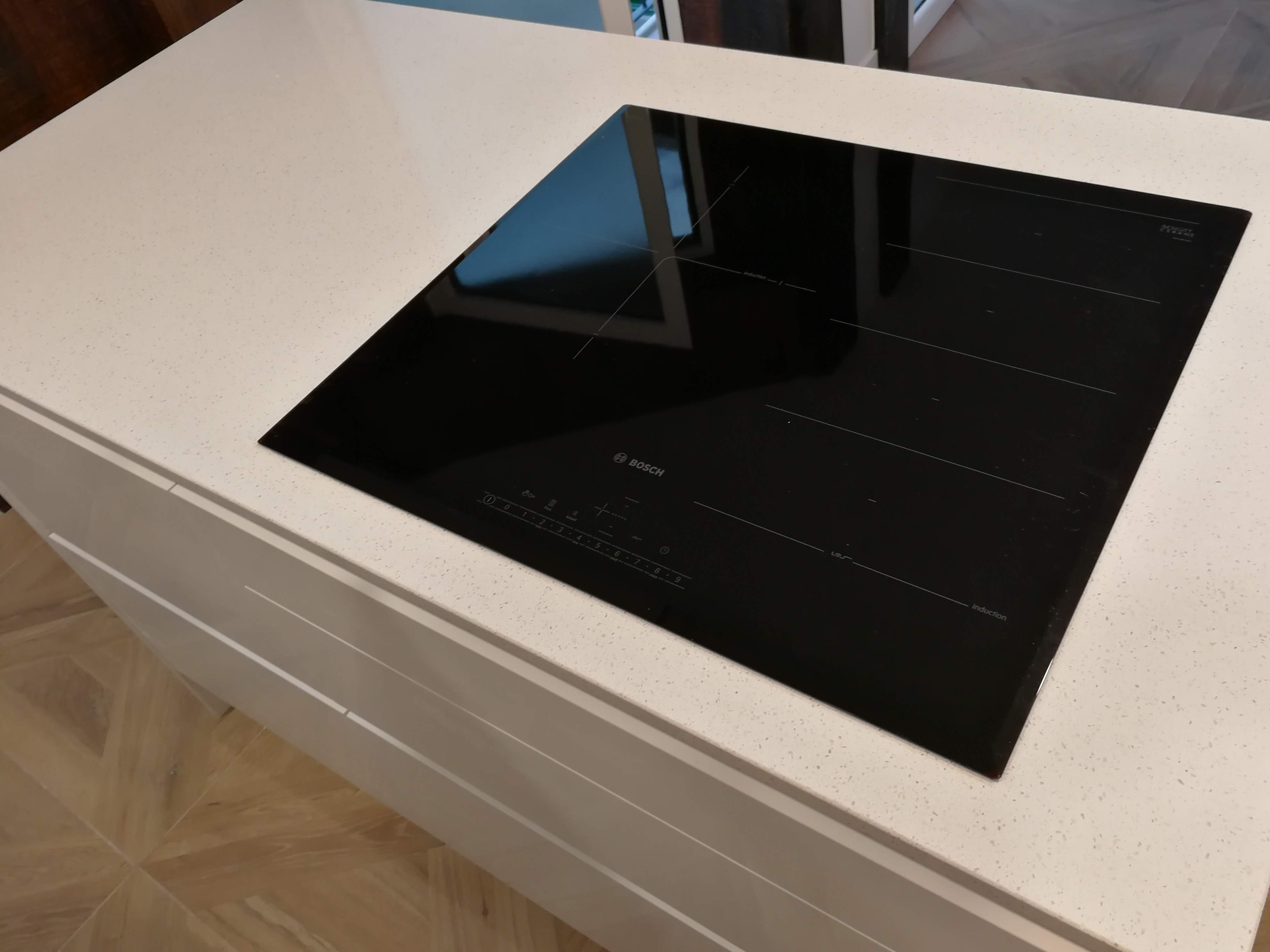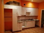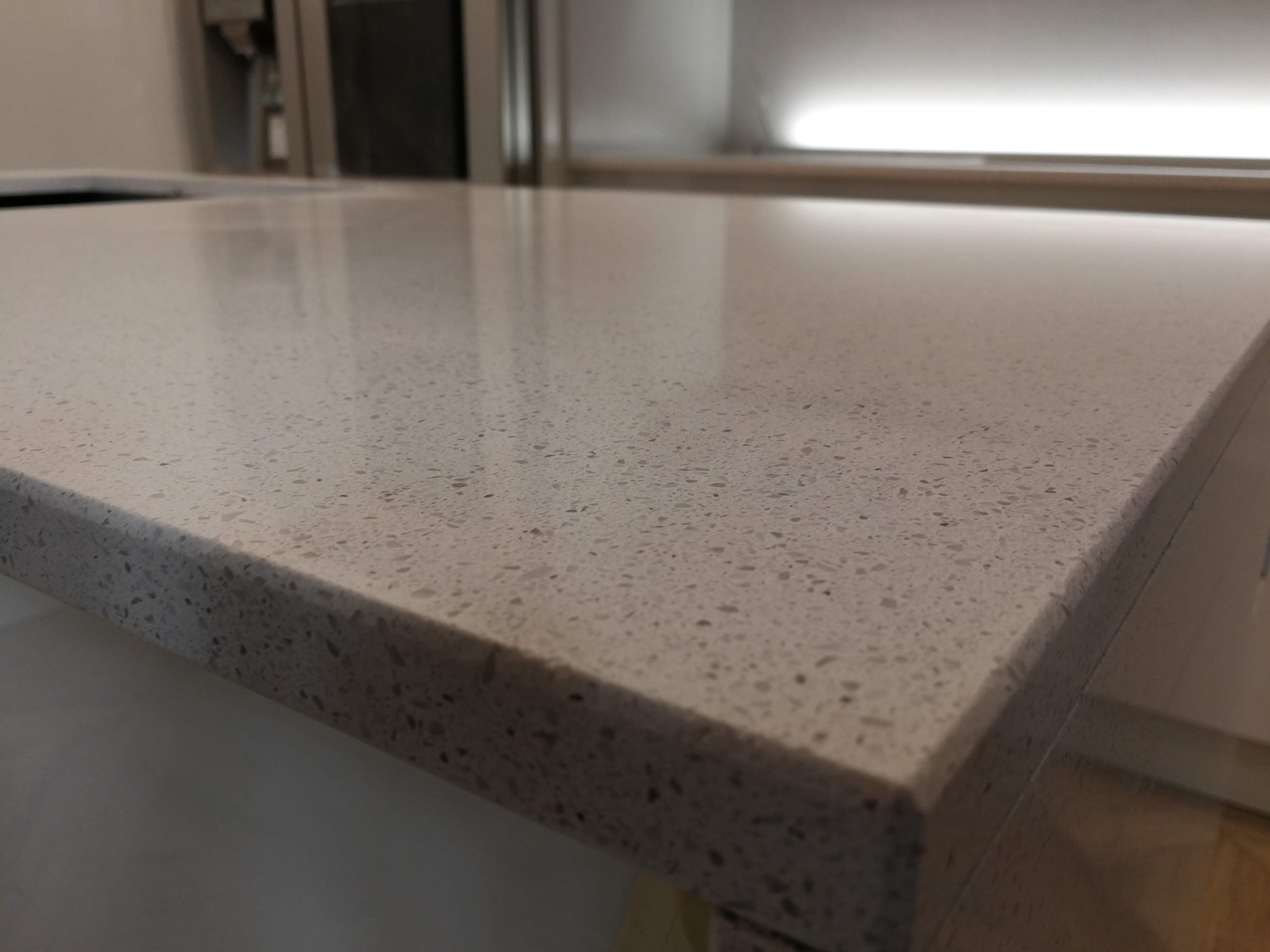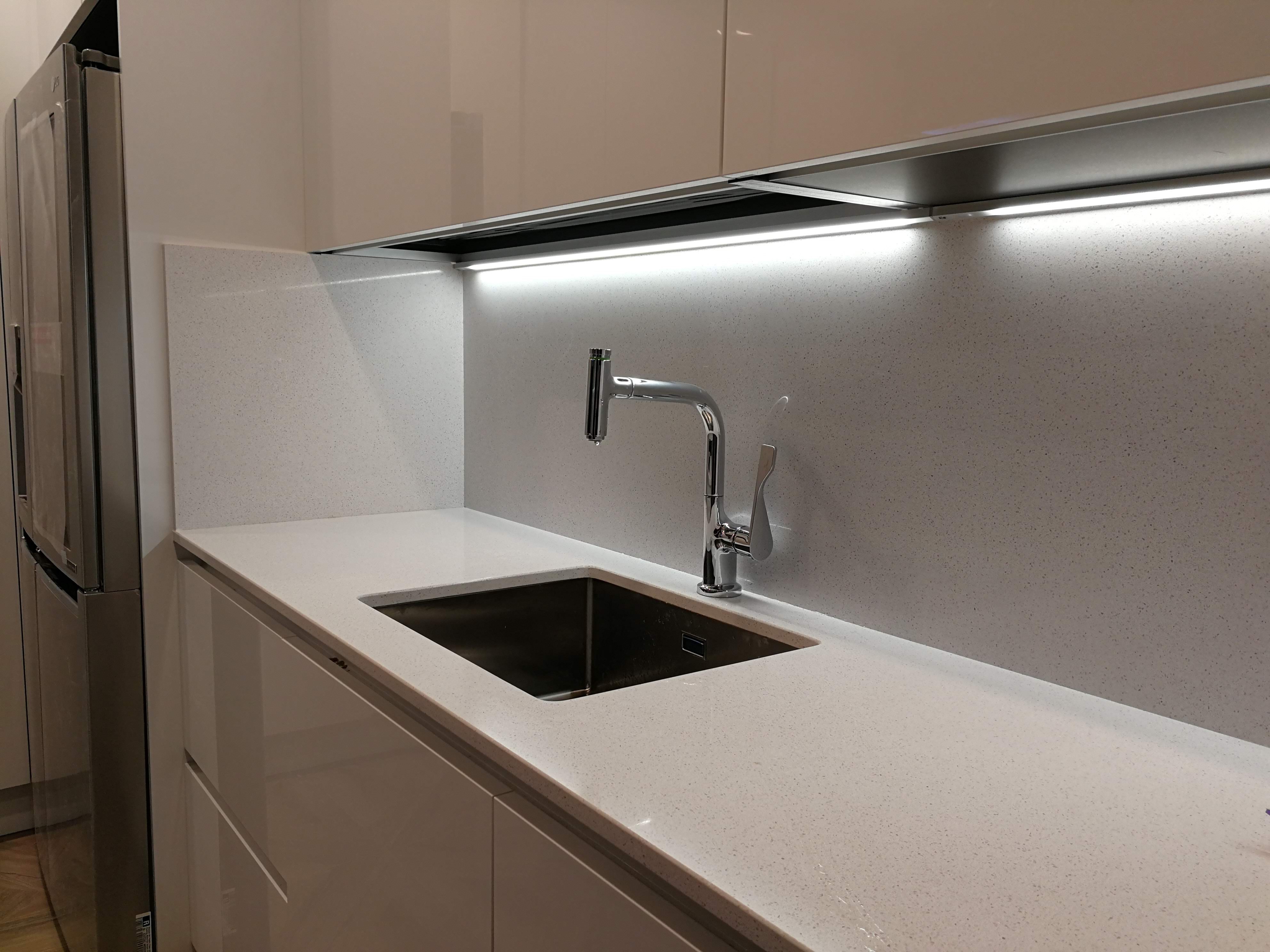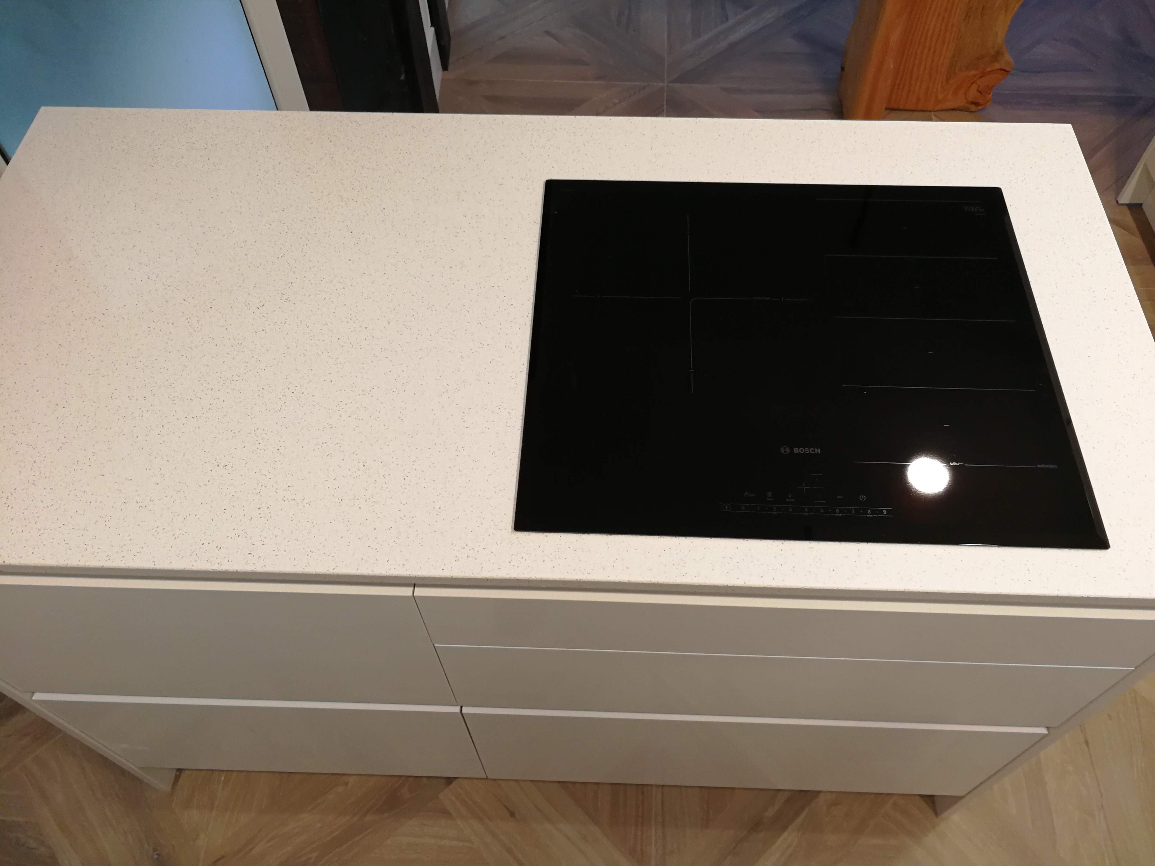 Son dos frentes de muebles color blanco con una isla central todo rematado con silestone.