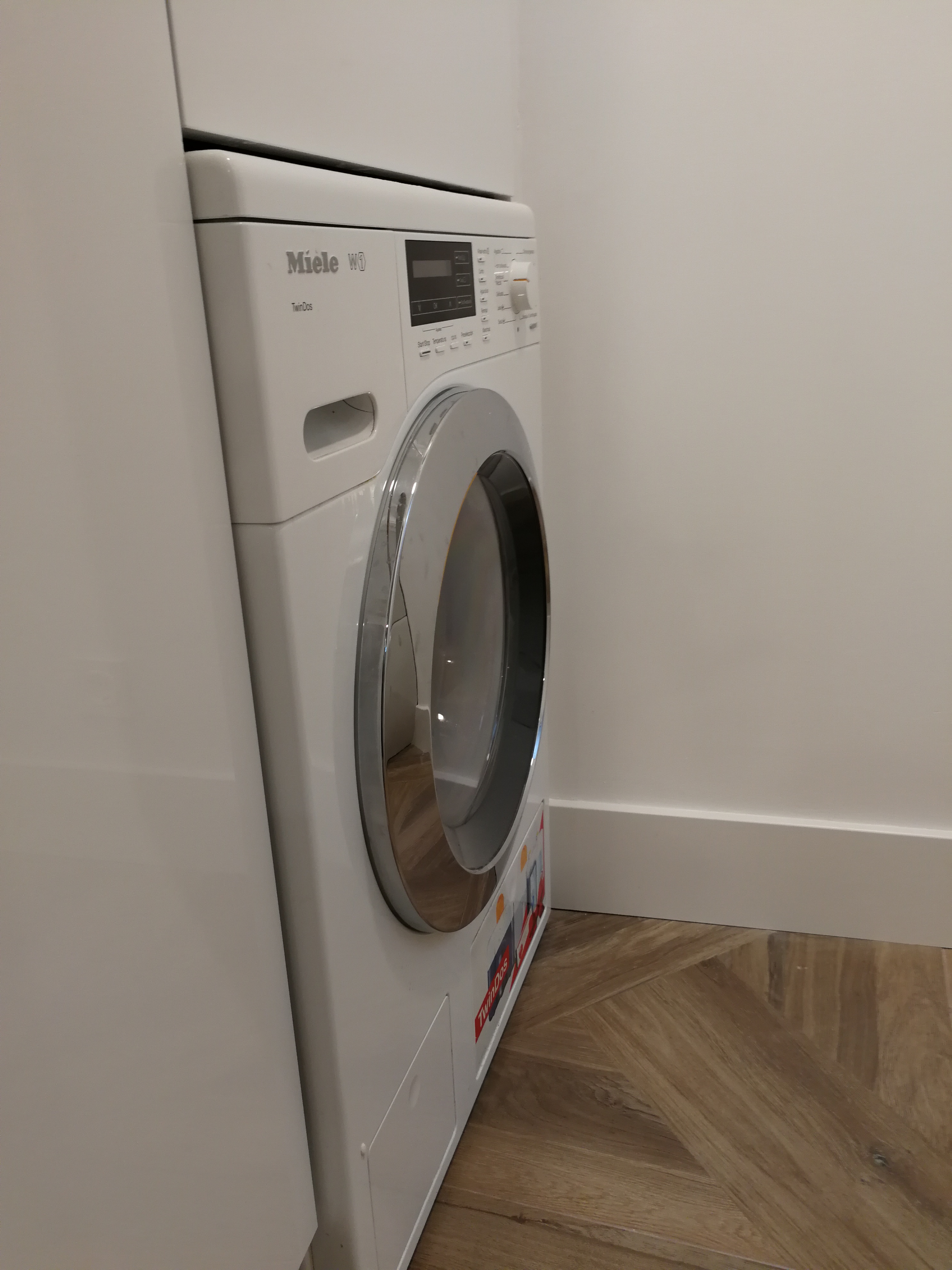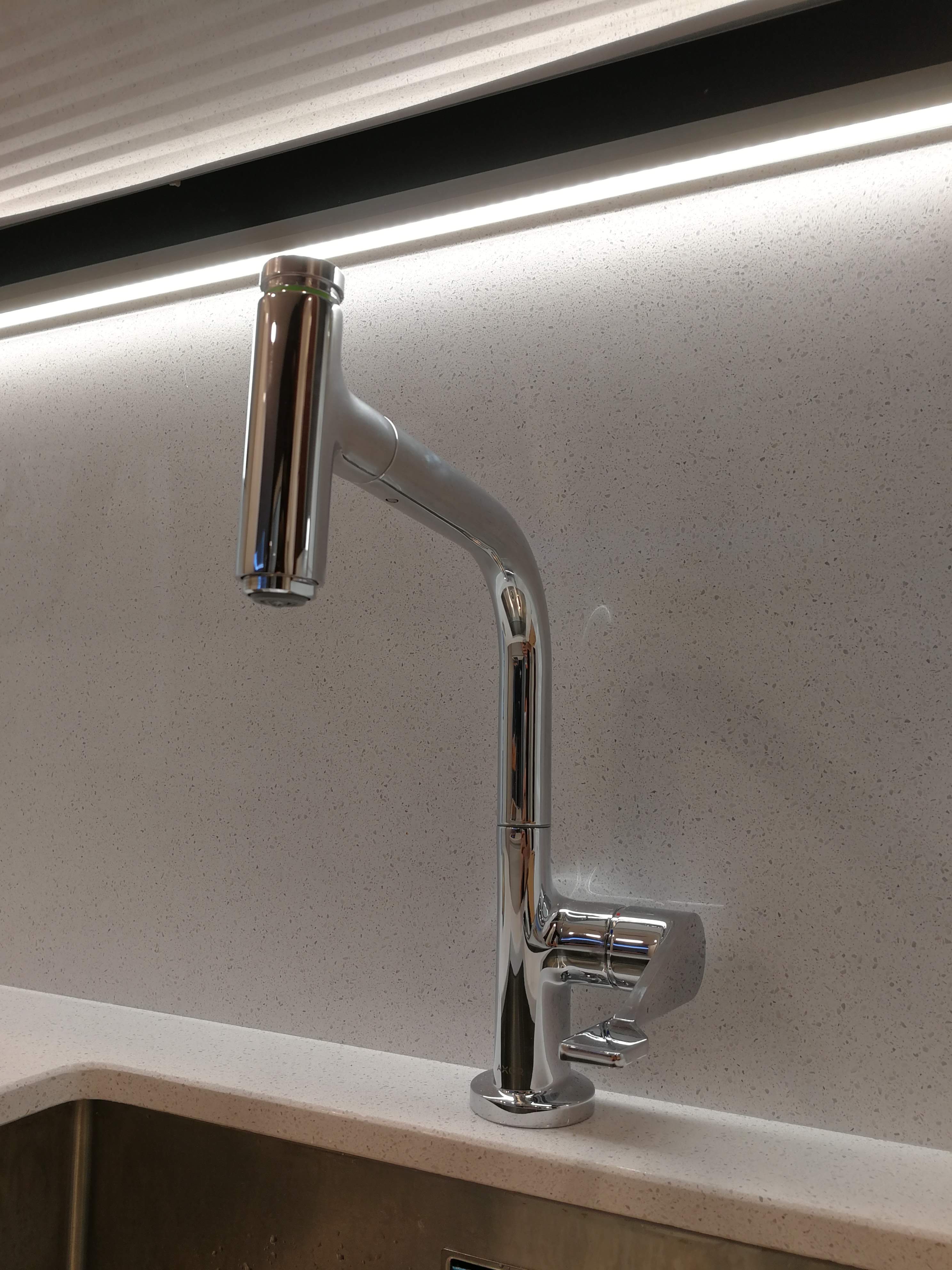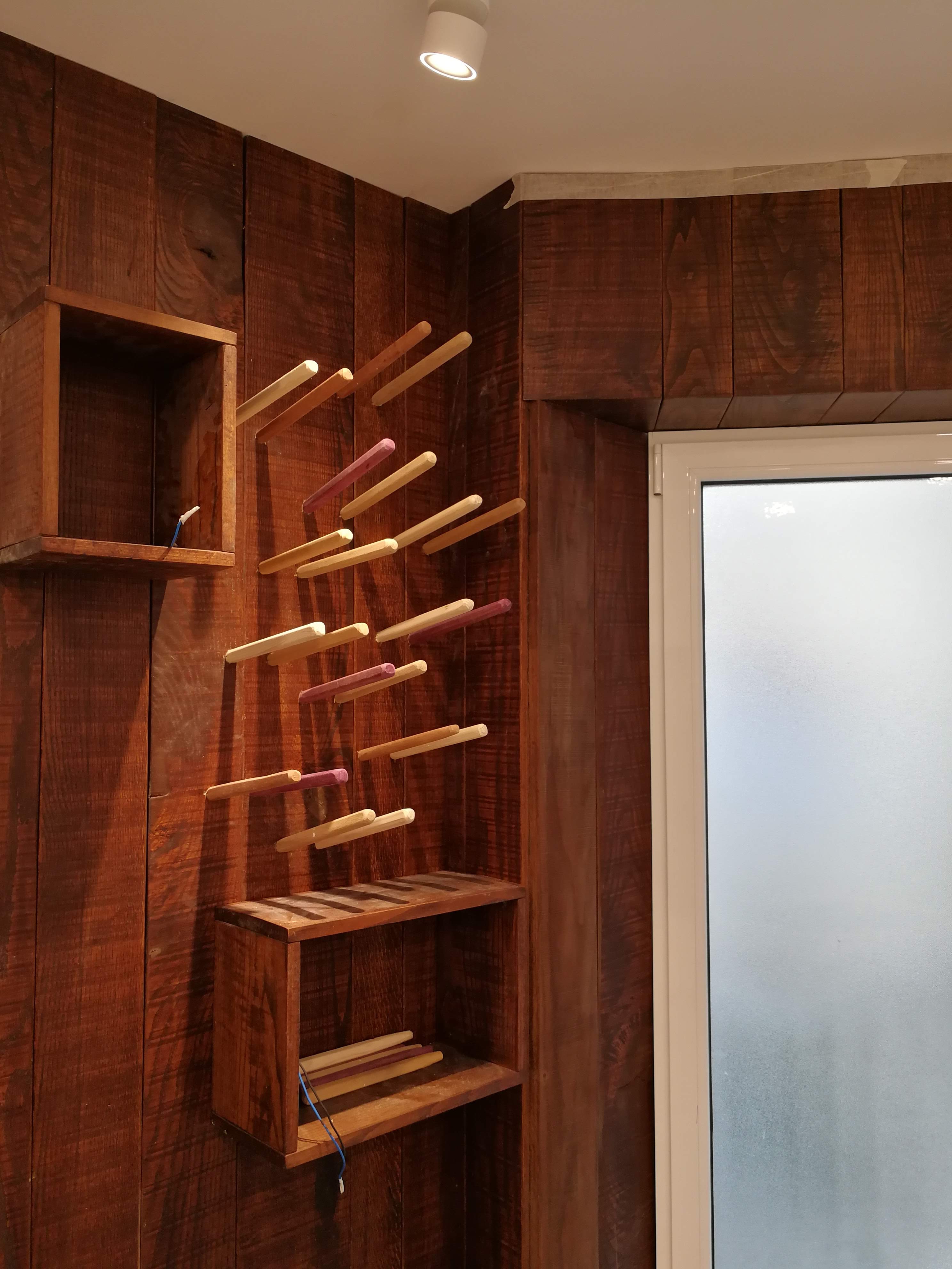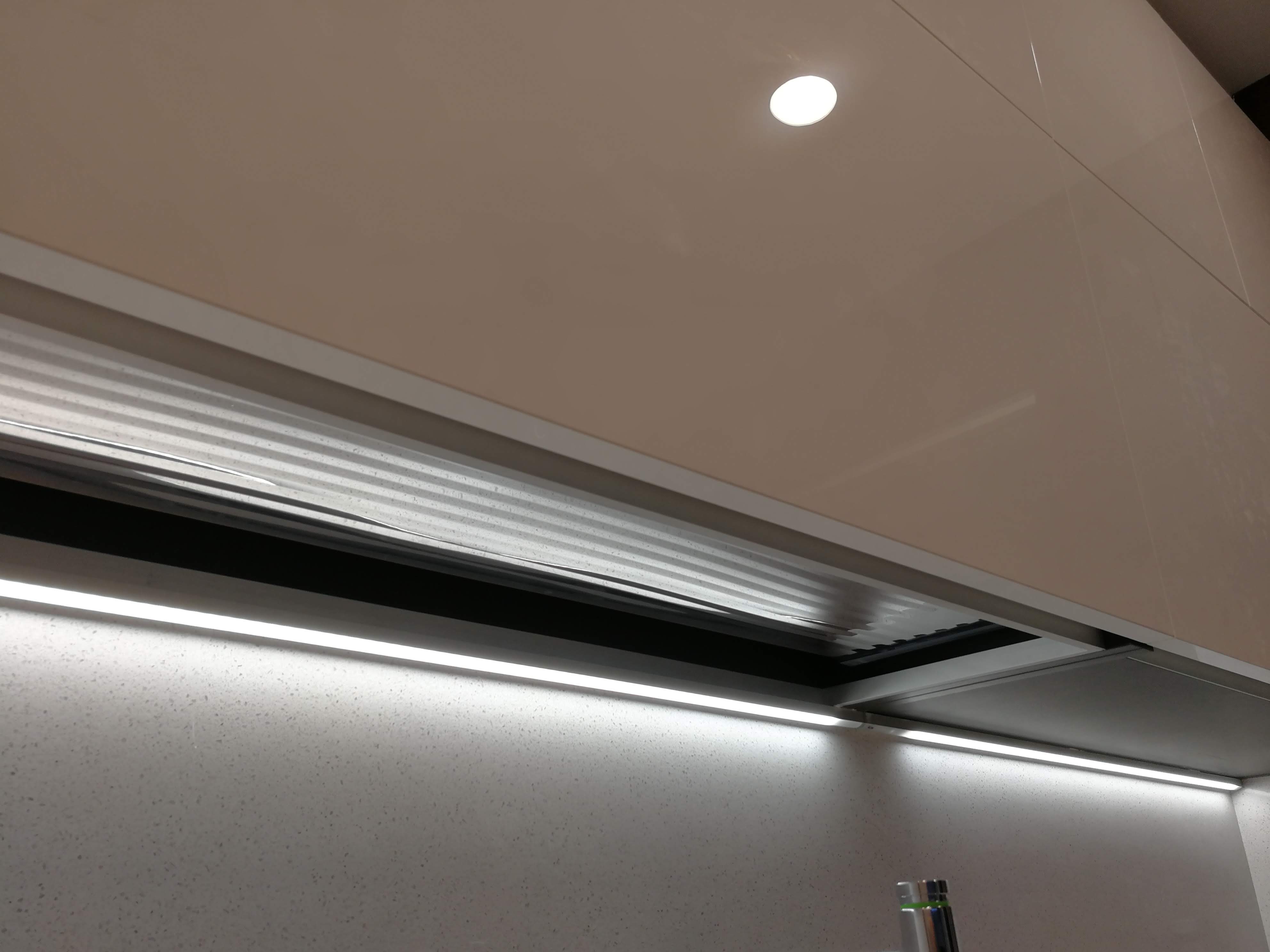 También un frigorífico americano y en un lateral se ha revestido la pared con lamas de madera, incluyendo un original botellero y dos cajas todo rematado con luz Led, al igual que la encimera.