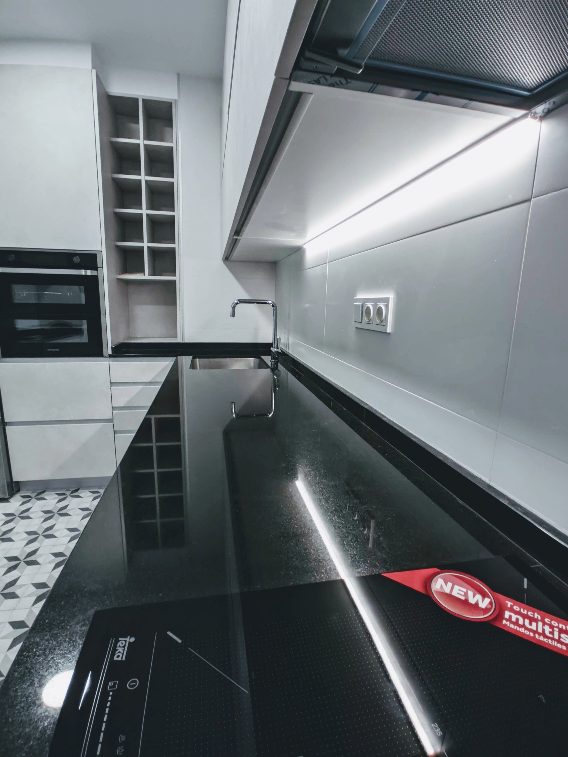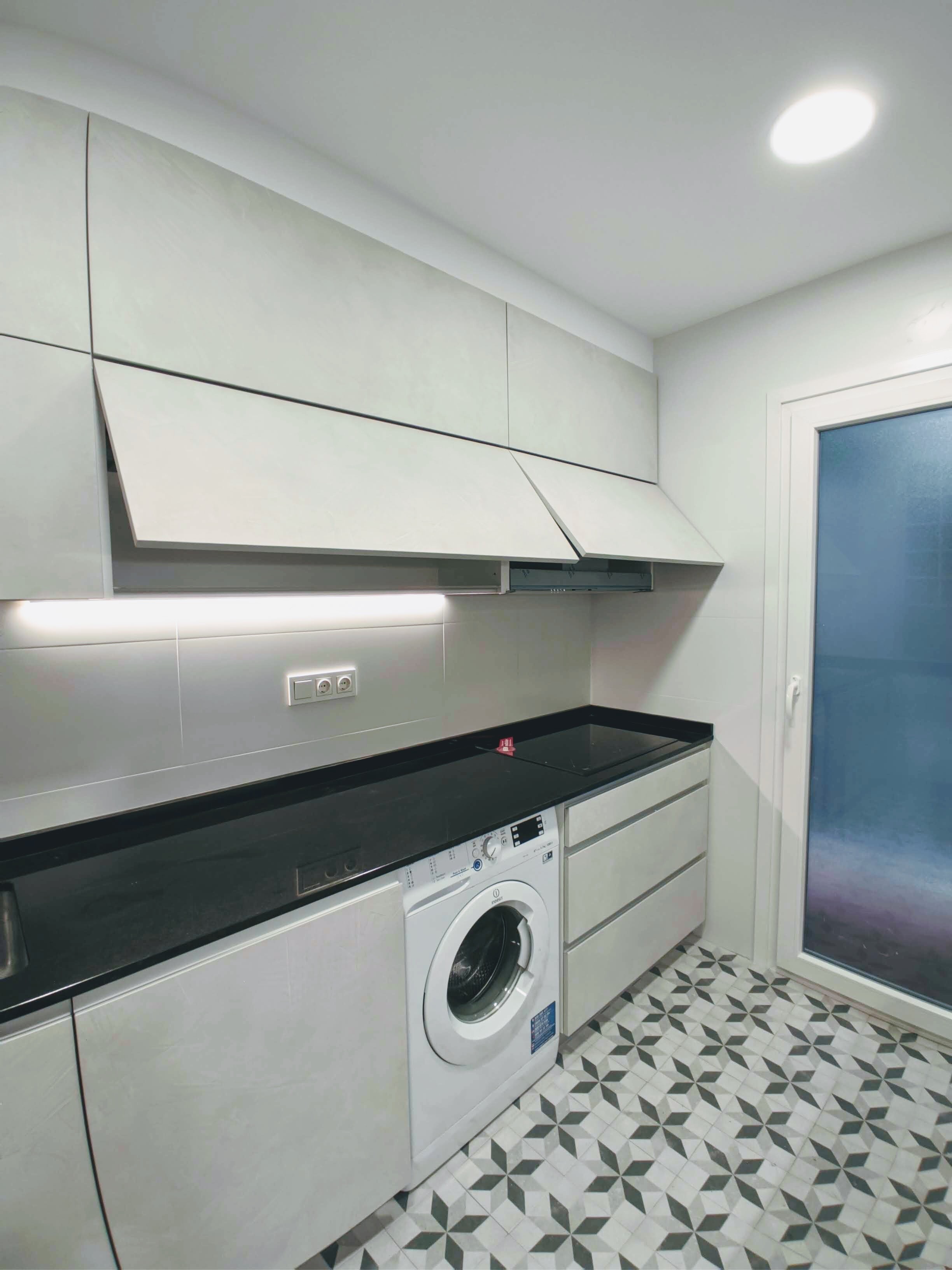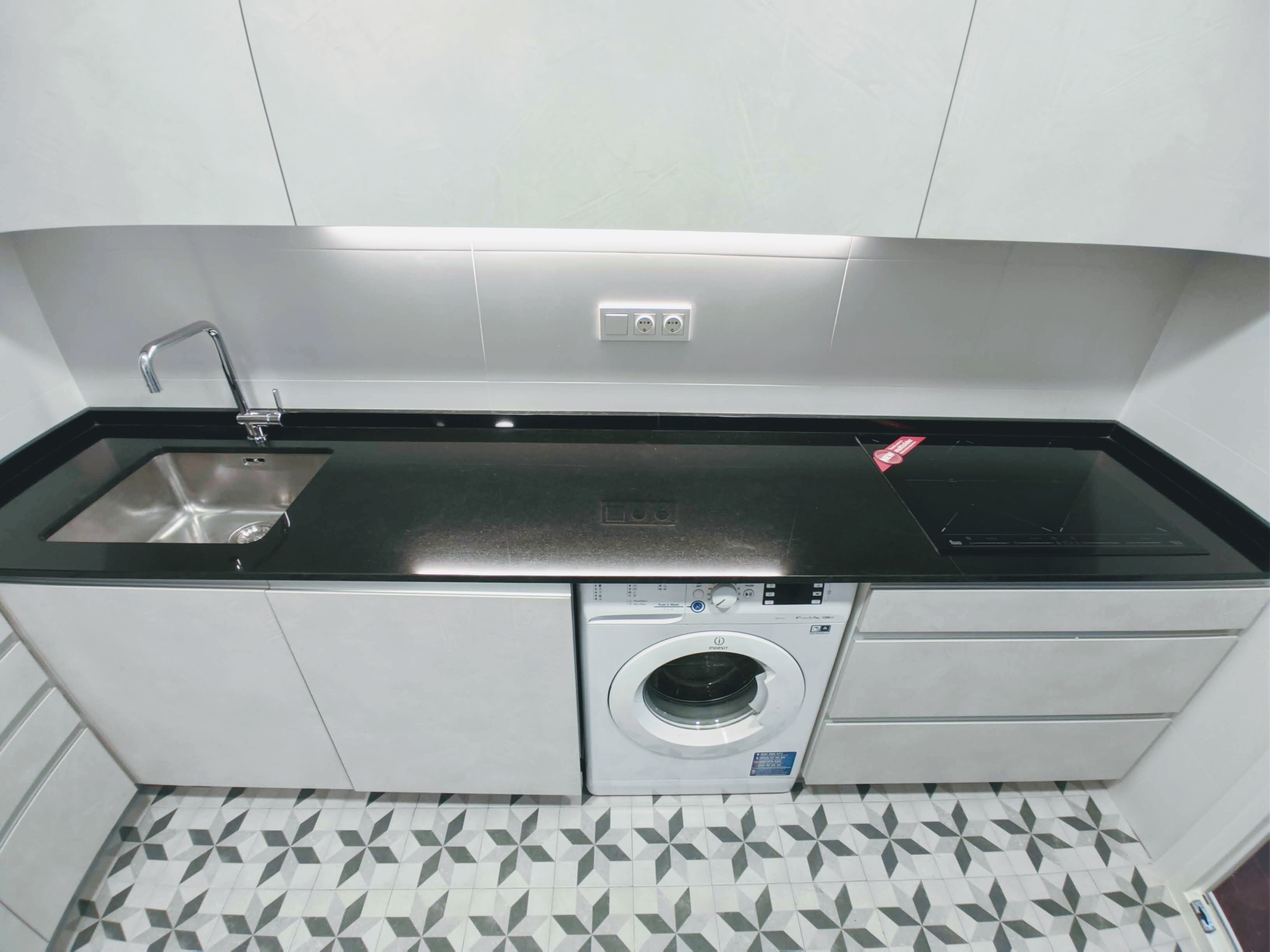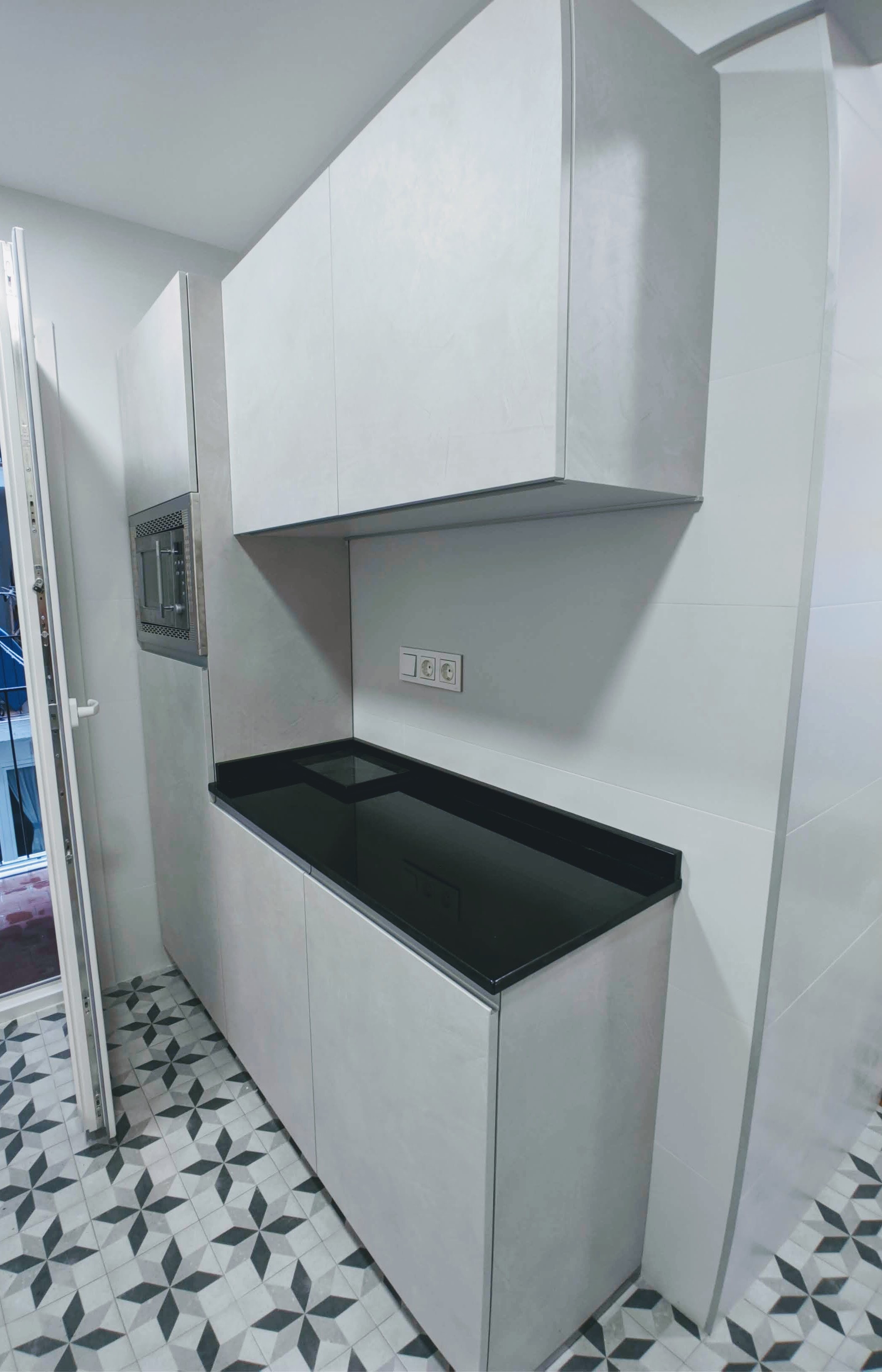 Los muebles son de color gris claro, y la encimera de granito negro.