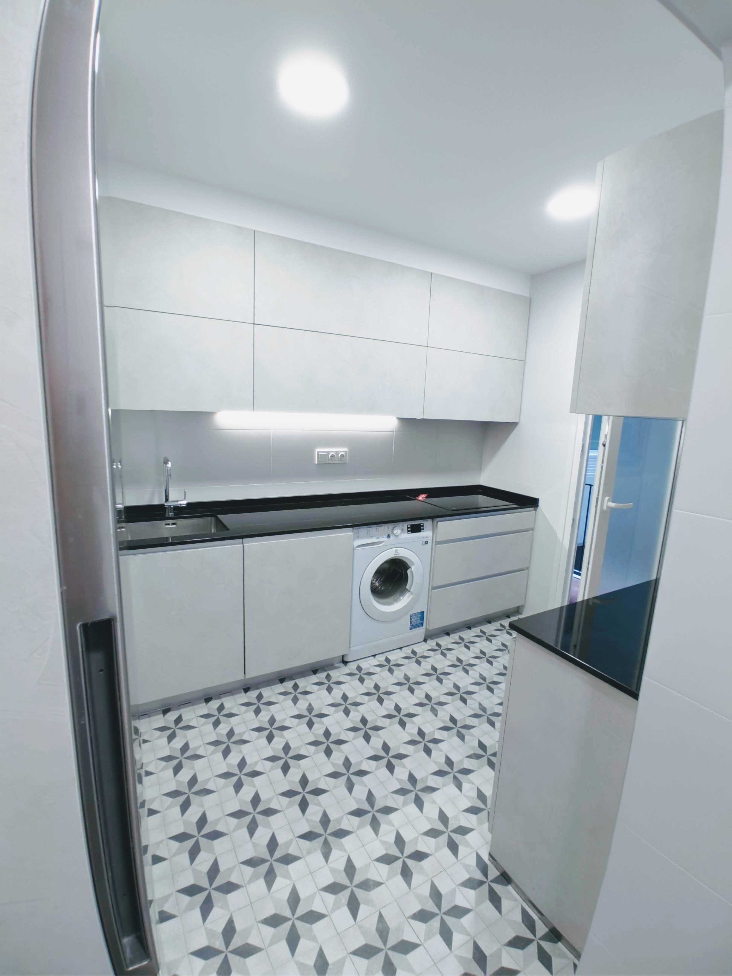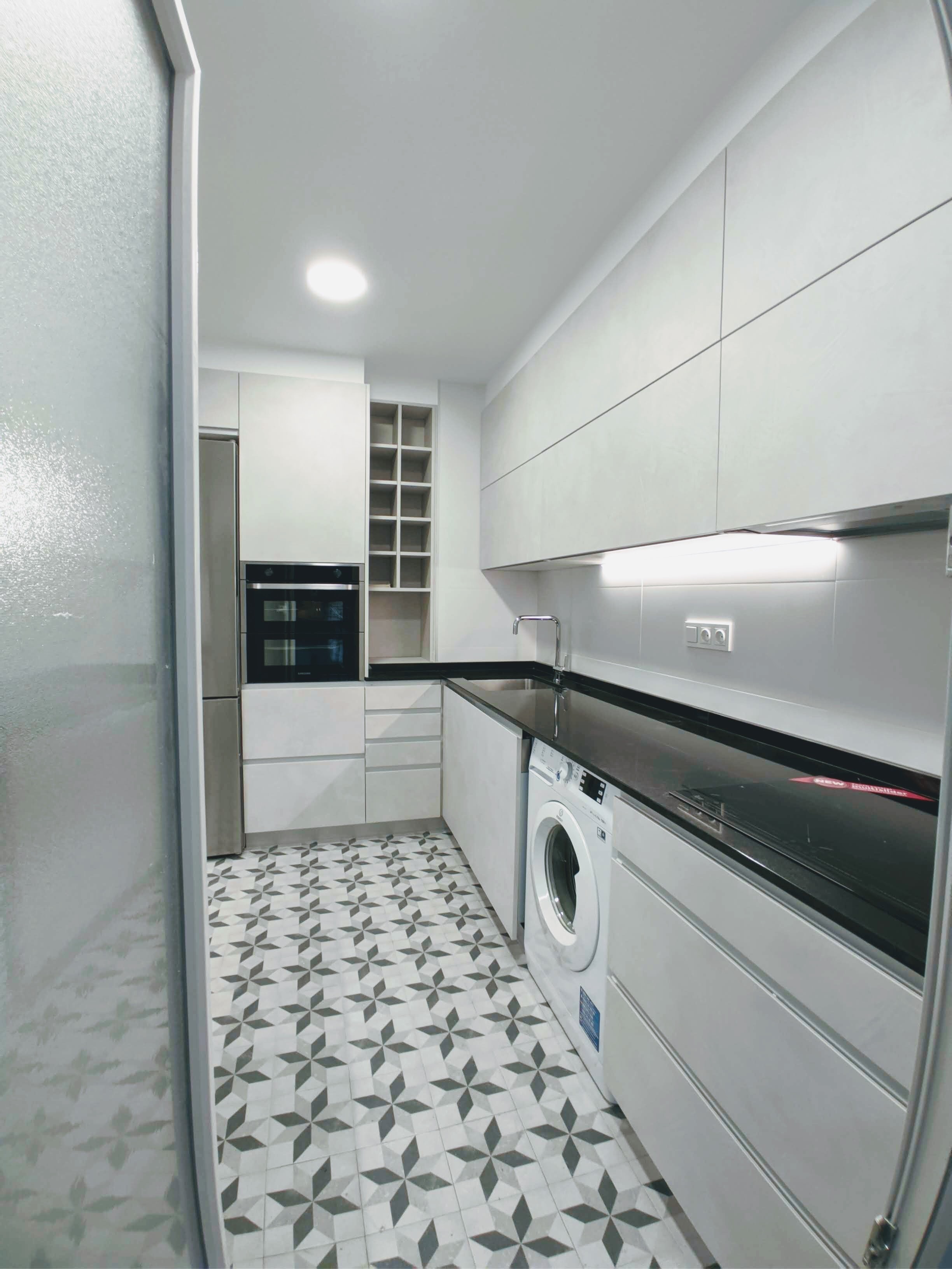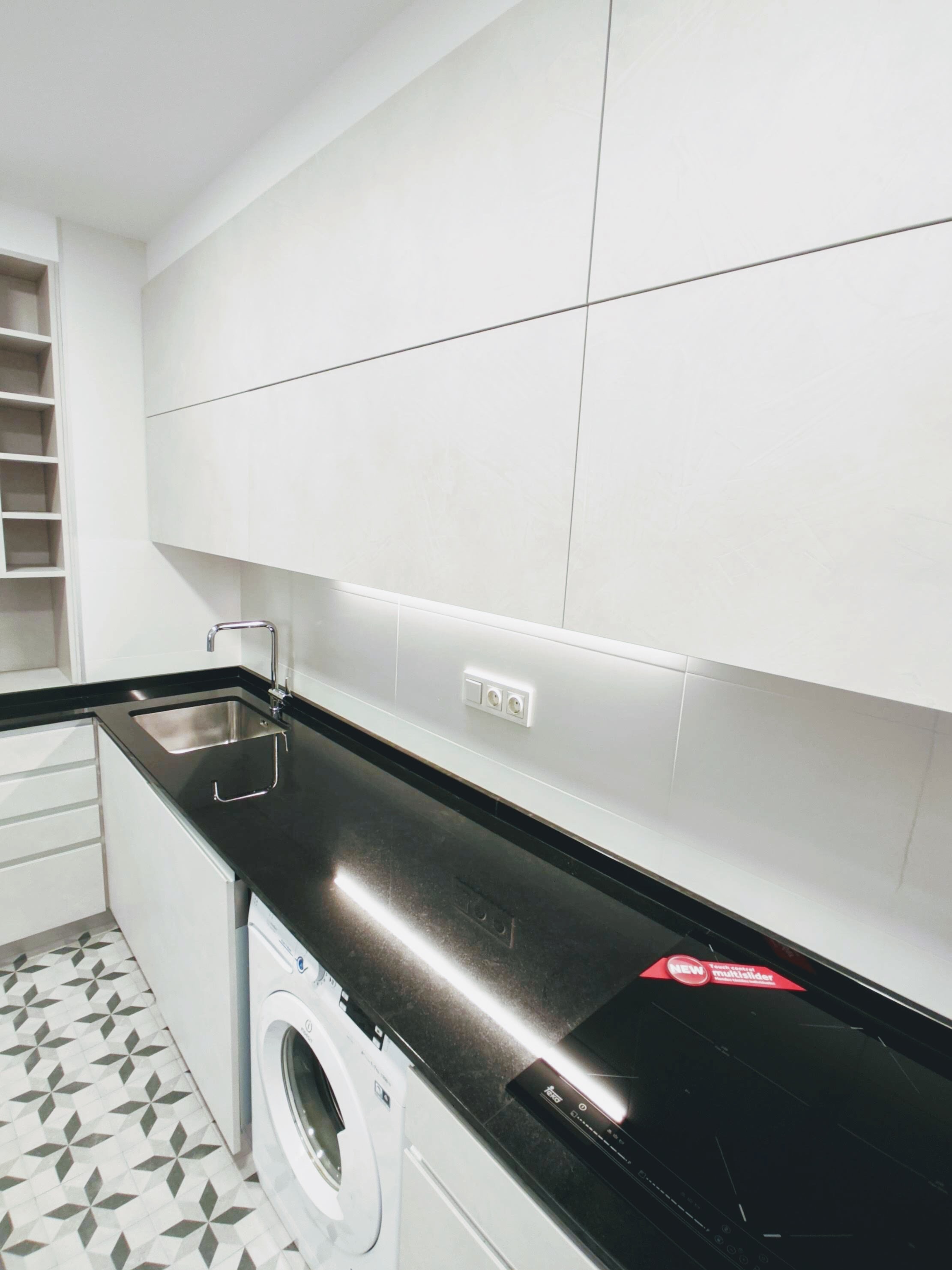 Los muebles son de color gris claro, y la encimera de granito negro.
