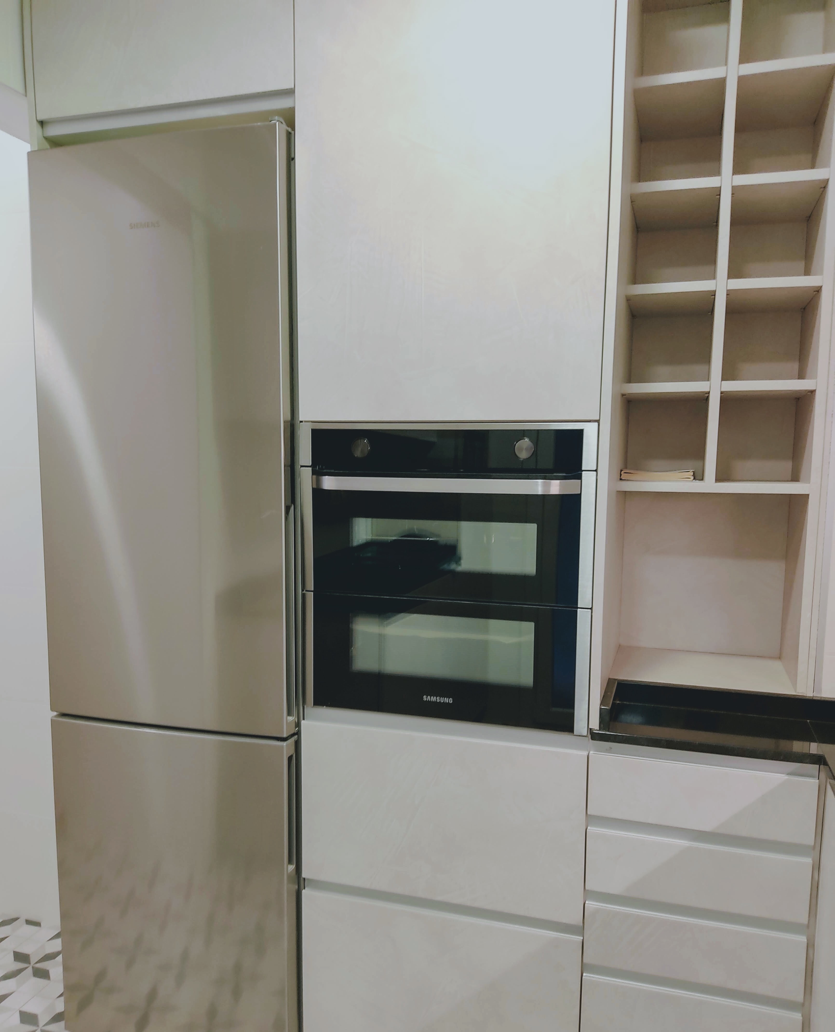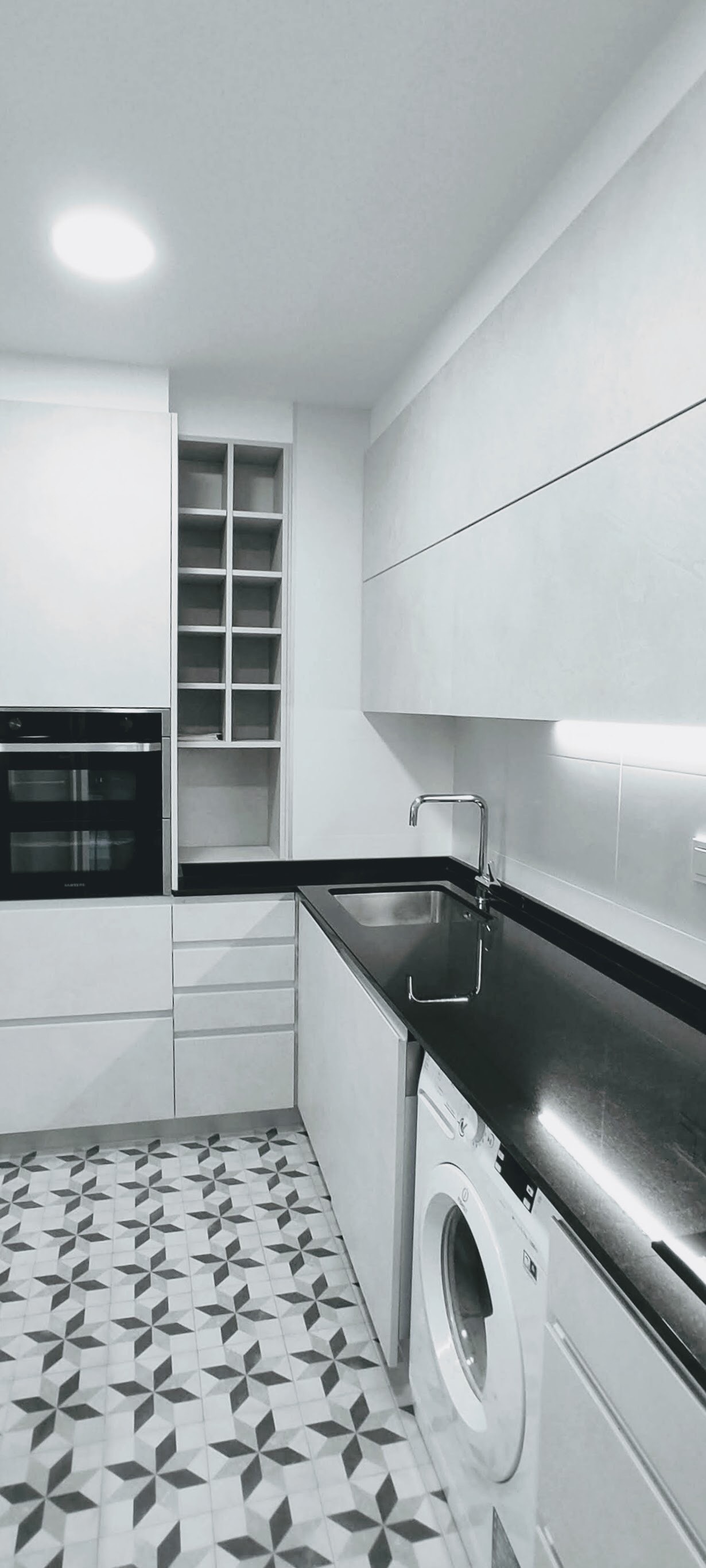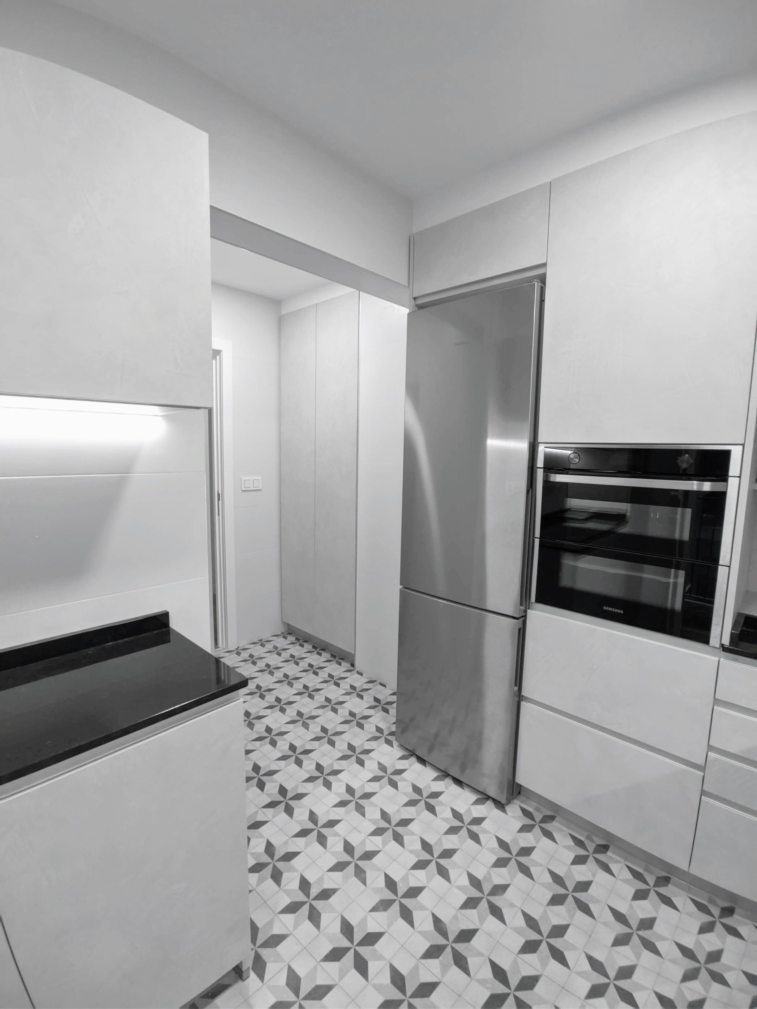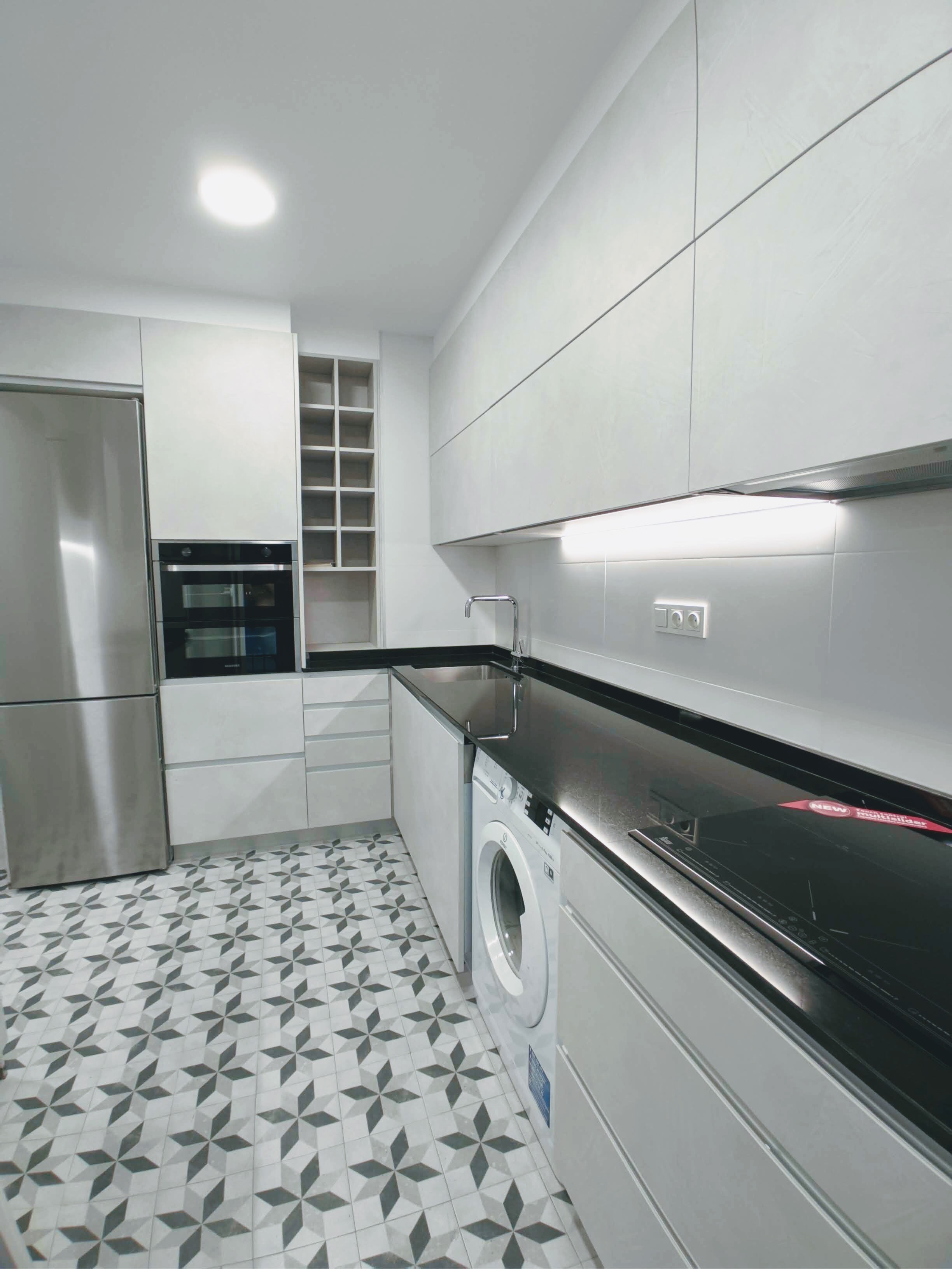 Los muebles son de color gris claro, y la encimera de granito negro.