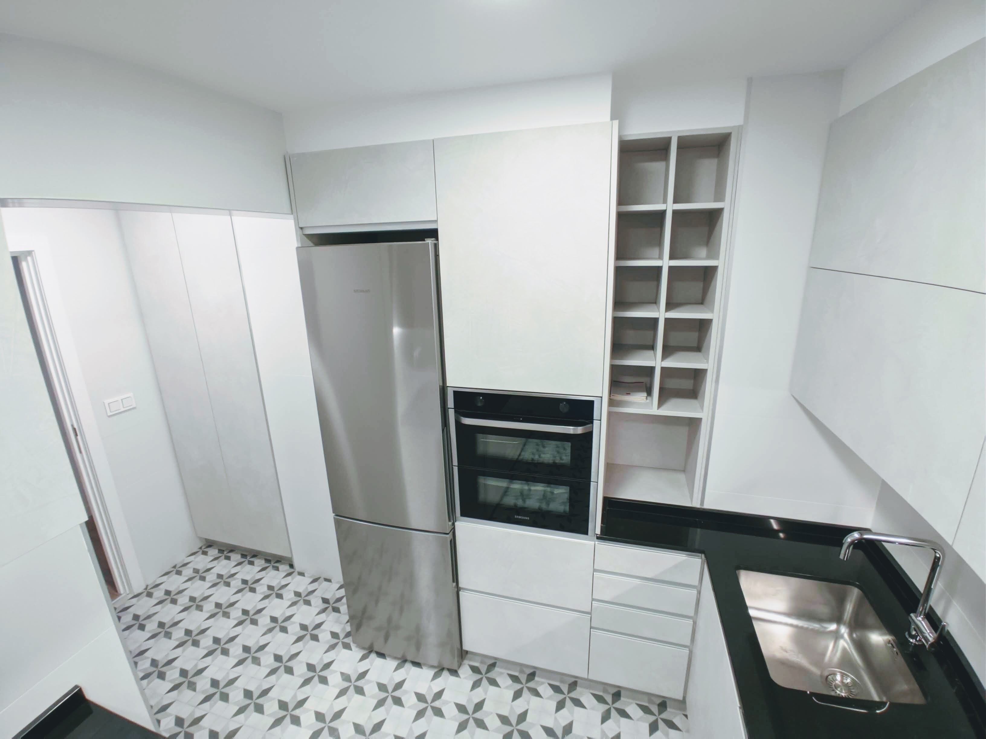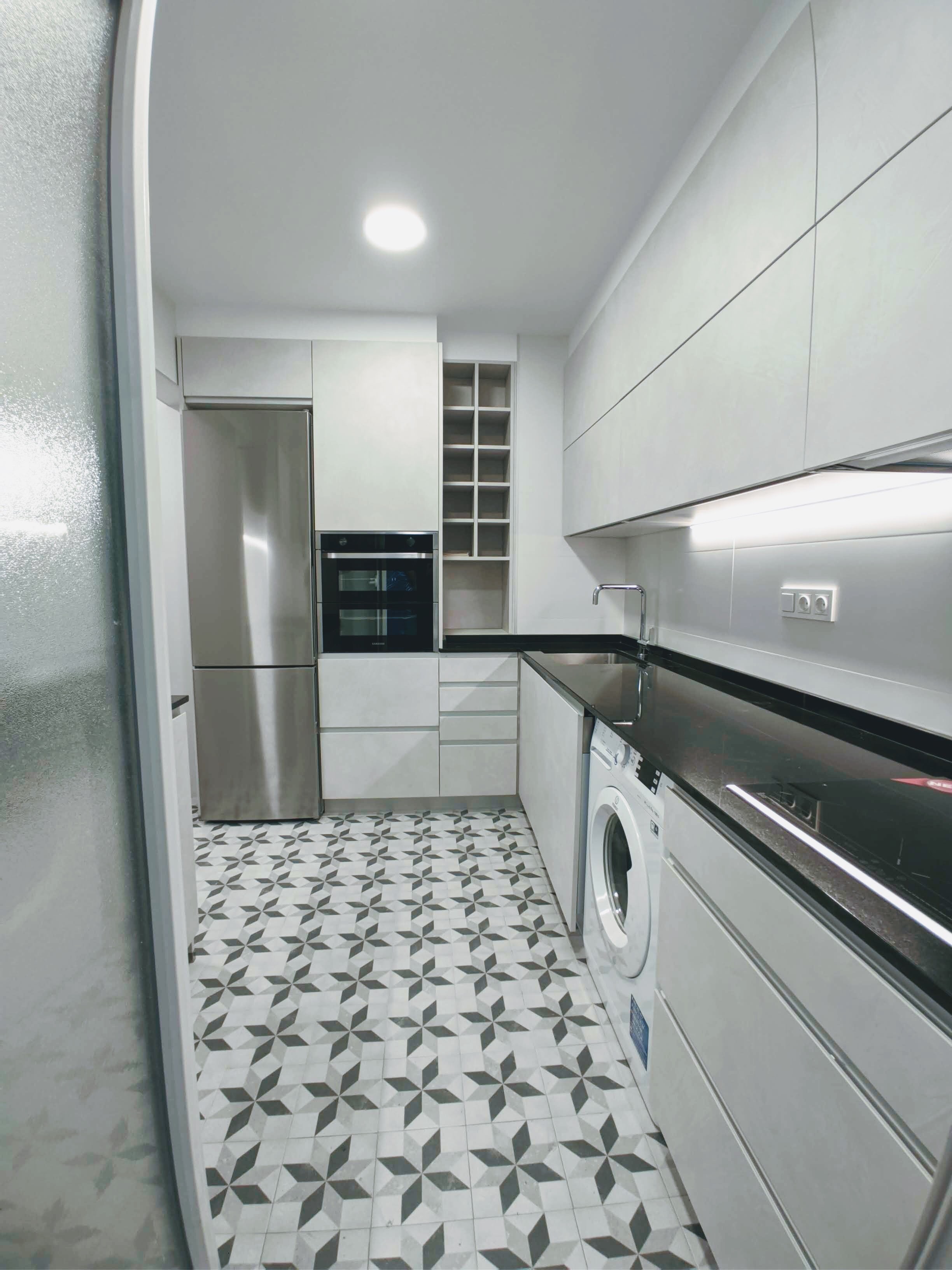 Los muebles son de color gris claro, y la encimera de granito negro.