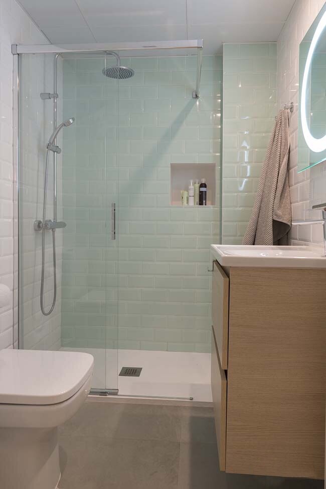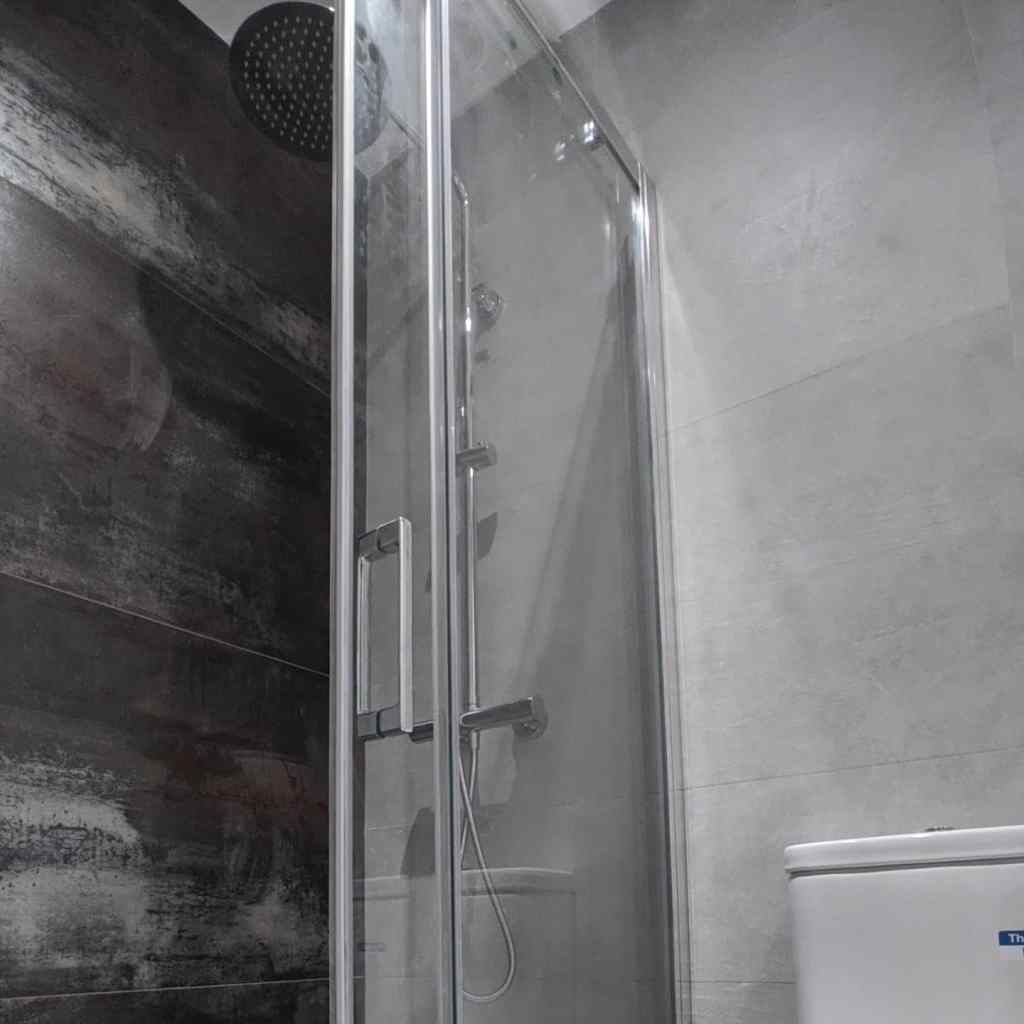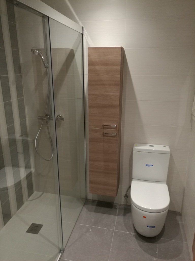 Montaremos entonces el inodoro, mueble de lavabo, griferías, espejo, apliques de luz, accesorios, etc…y la mampara de ducha o bañera.